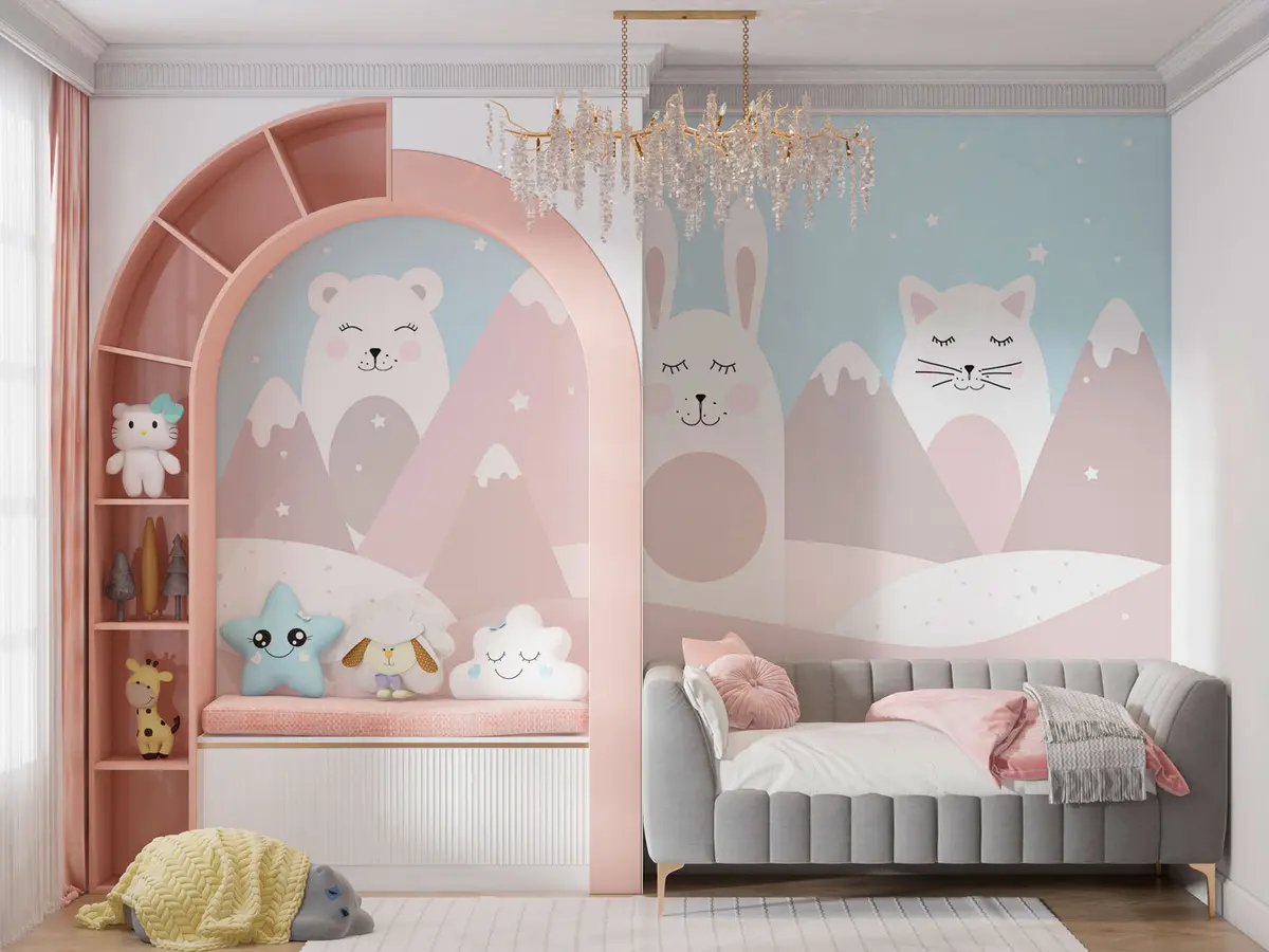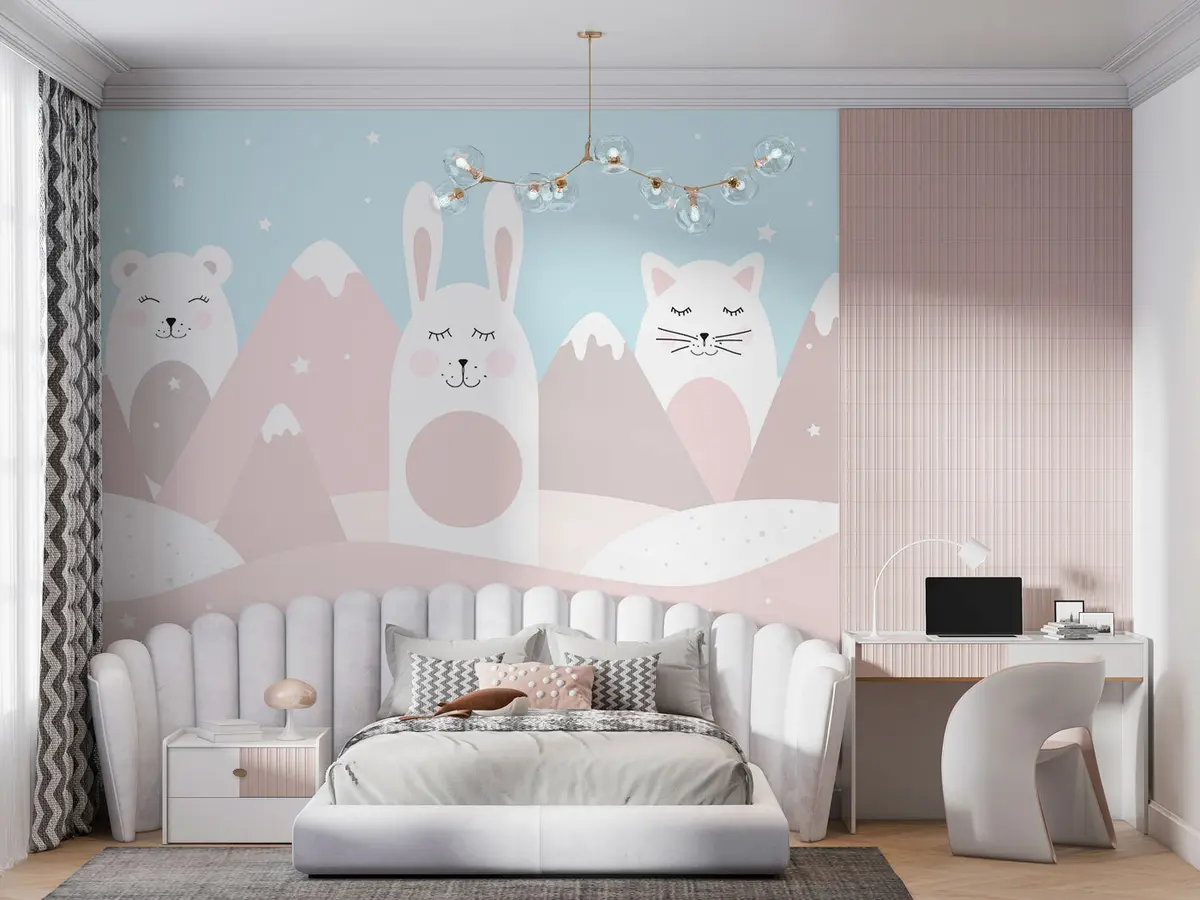 Zidne murale Zec, medvjed, lisica na pozadini bež snježnih planina br. u98135