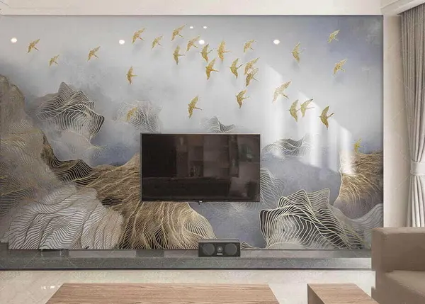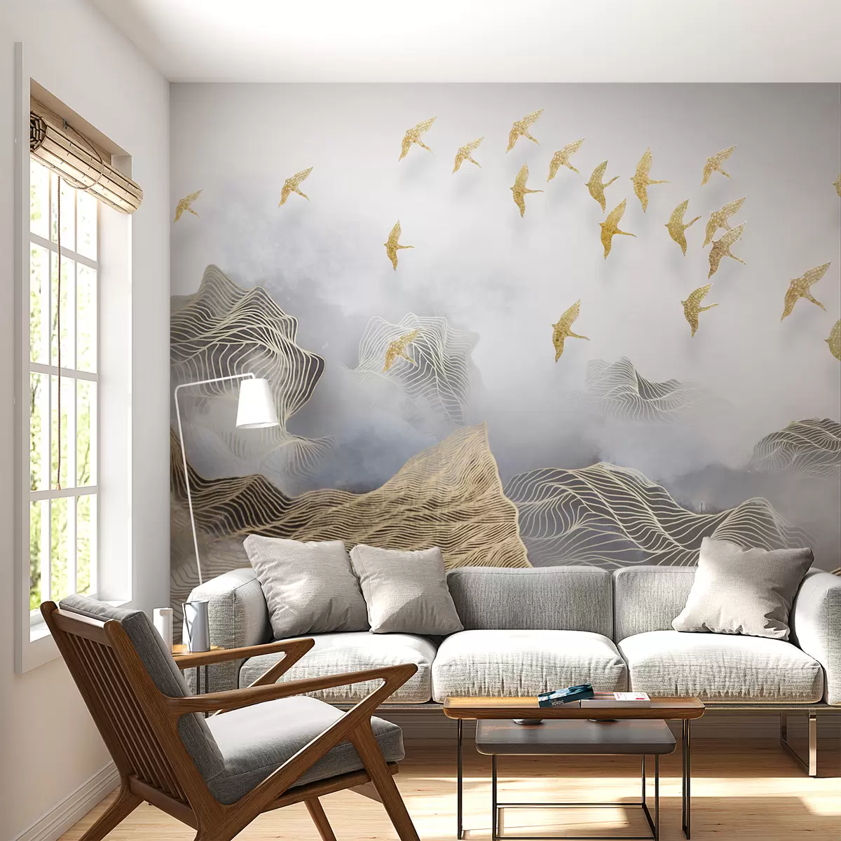 Zidne murale Prekrasan krajolik s planinama i pticama nacrtan je tankim linijama br. u44870