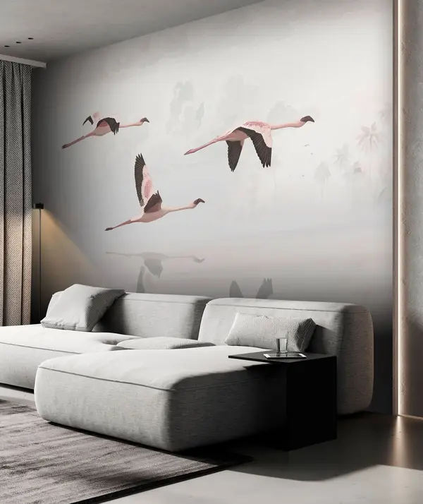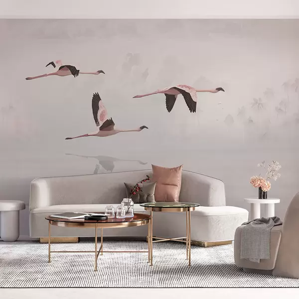 Zidne murale Ružičasti flamingosi iznad plaže i mora u tropskoj džungli br. u97457