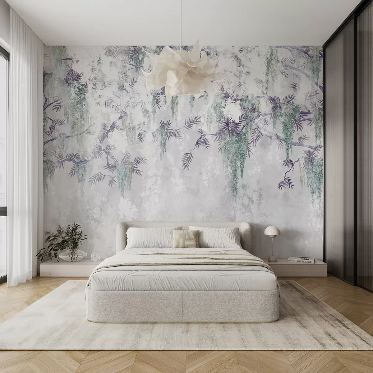 Zidne murale Viseće trendi grunge grane s ljubičastim cvjetovima u plavim bojama br. u73816v1