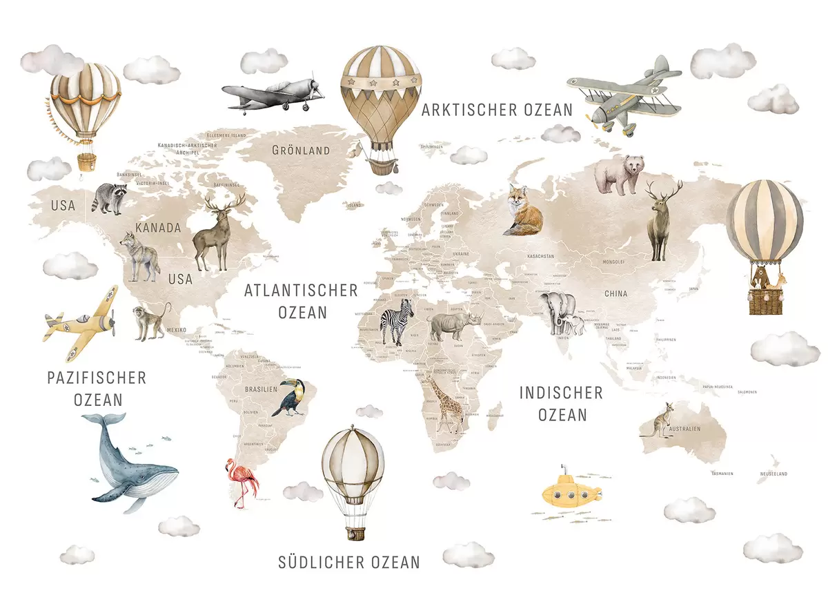 Zidne murale Dječja karta u akvarelnom stilu sa životinjama i balonima na vrući zrak. Njemački jezik. Bež boja. br. c00001dev2
