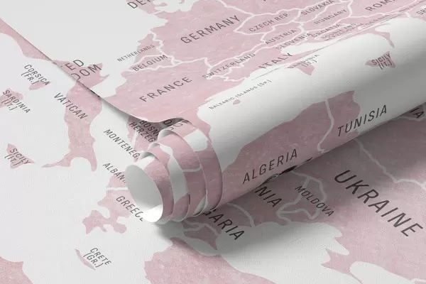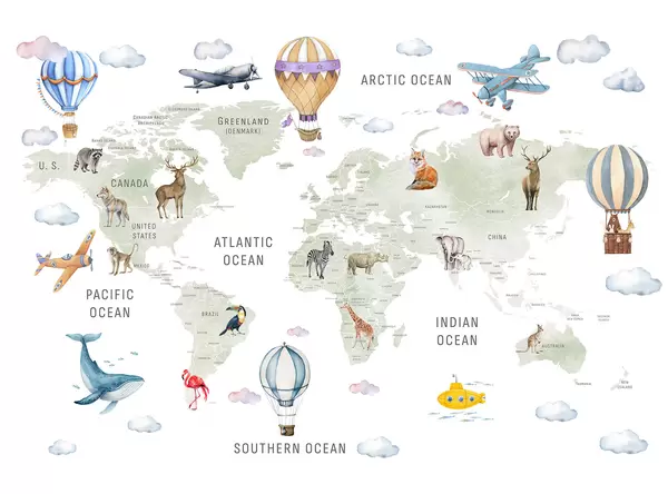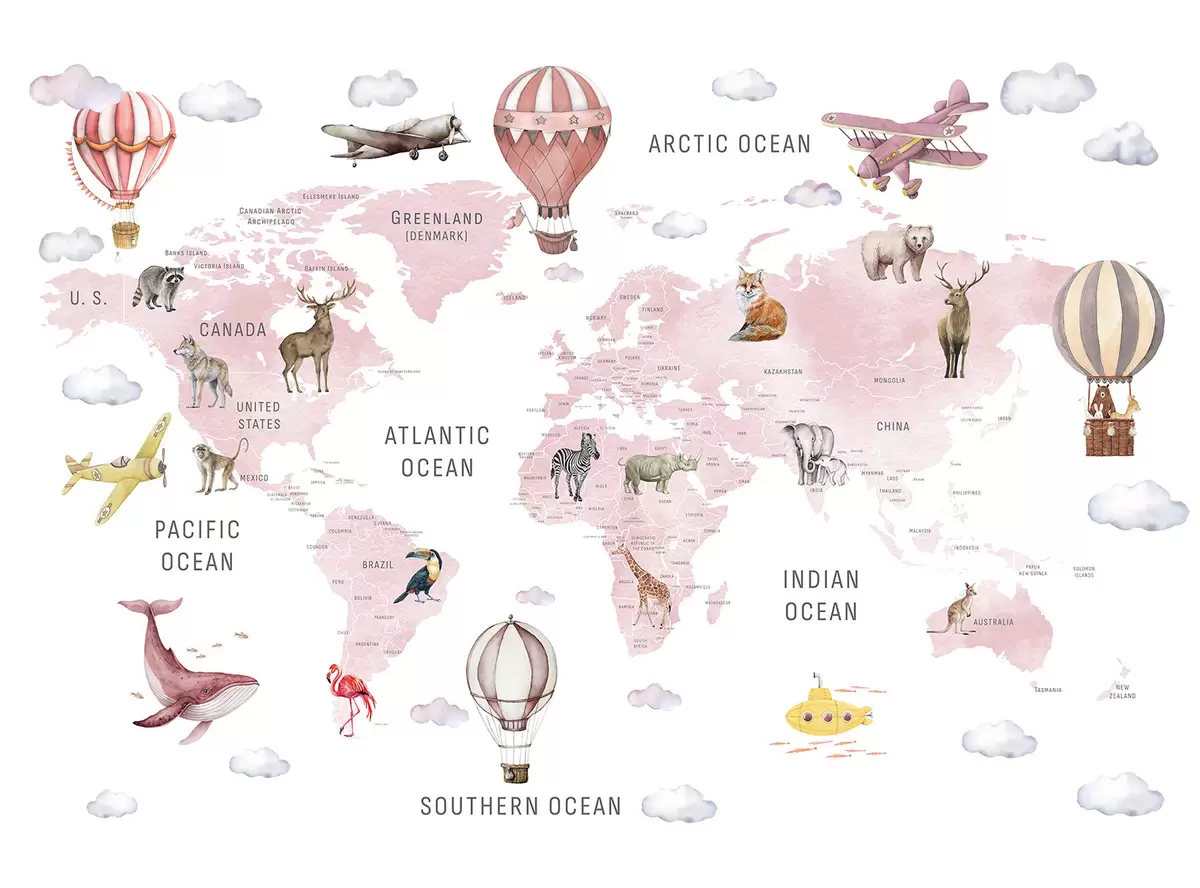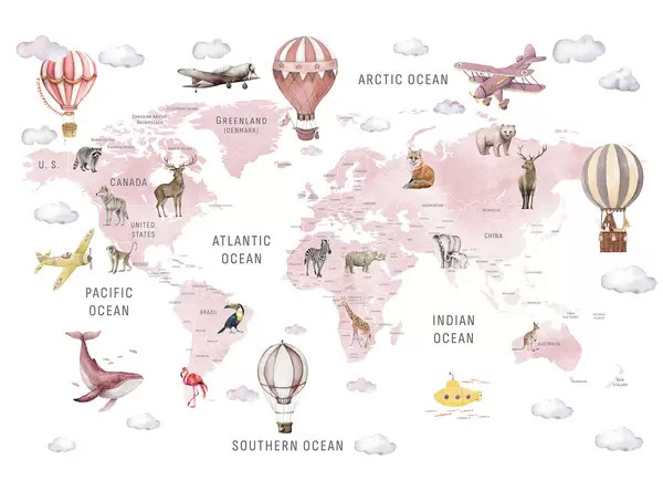 Zidne murale Dječja karta u akvarelnom stilu sa životinjama i balonima na vrući zrak. Engleski jezik. Ružičasta boja. br. c00001env3