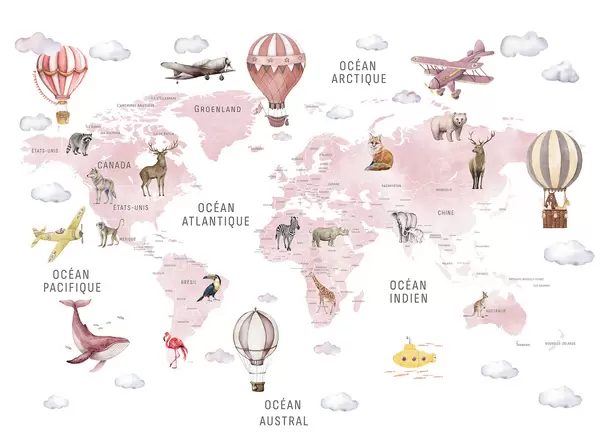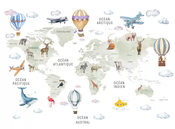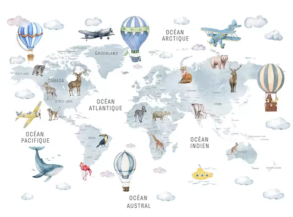 Zidne murale Dječja karta u akvarelnom stilu sa životinjama i balonima na vrući zrak. Francuski jezik. Plava boja. br. c00001frv1