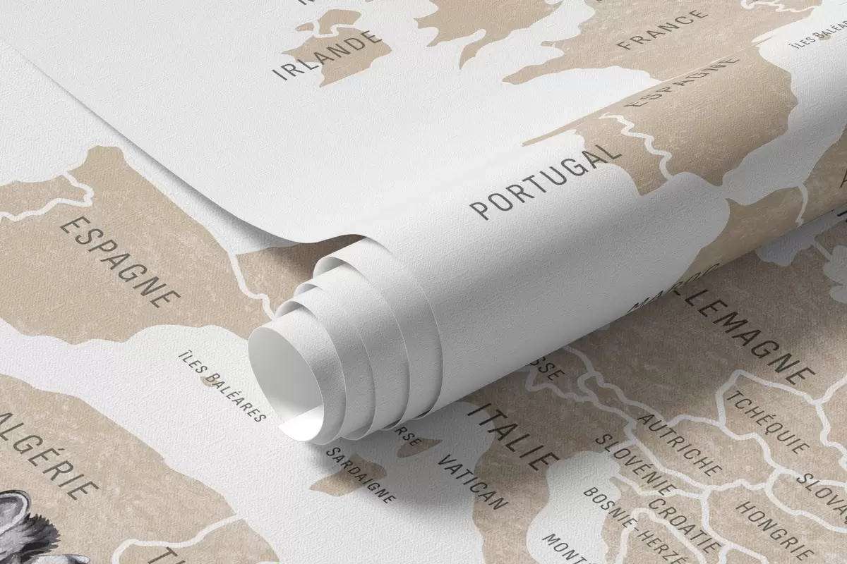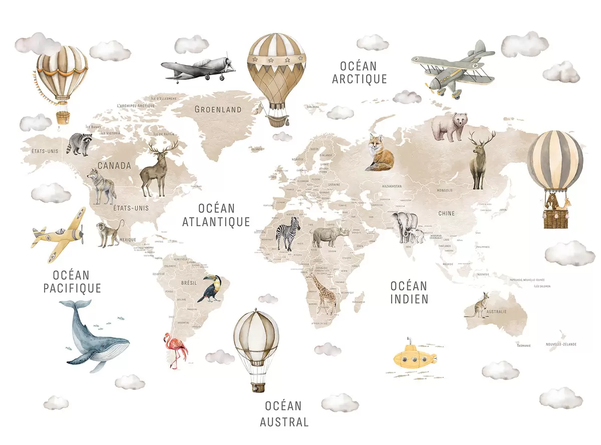 Zidne murale Dječja karta u akvarelnom stilu sa životinjama i balonima na vrući zrak. Francuski jezik. Bež boja. br. c00001frv2