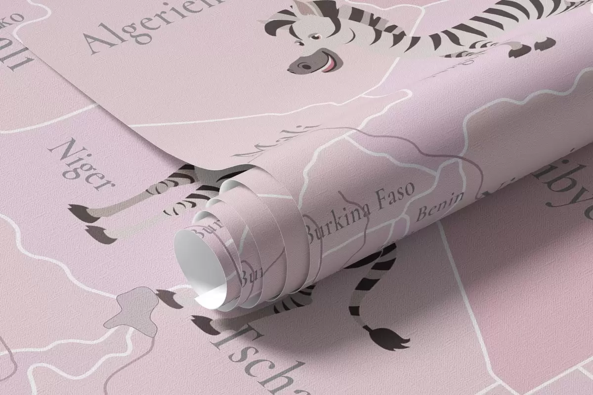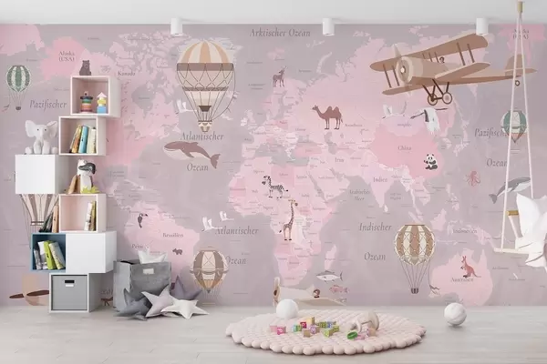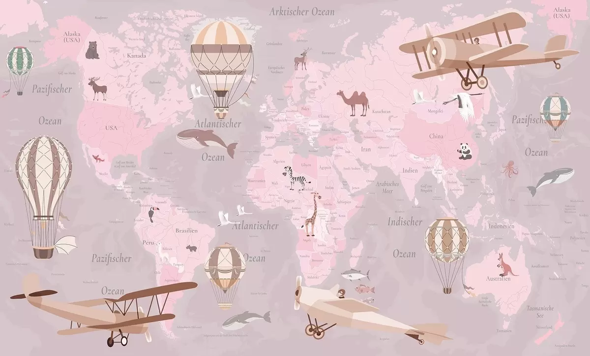 Zidne murale Dječja karta svijeta sa životinjama, avionima i balonima na vrući zrak. Njemački jezik. Ružičasta boja. br. c00003dev3