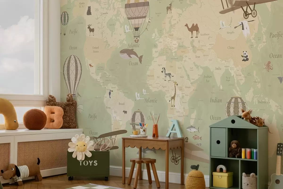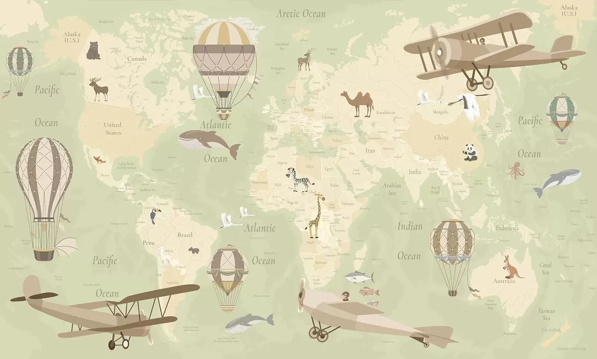 Zidne murale Dječja karta svijeta sa životinjama, avionima i balonima na vrući zrak. Engleski jezik. Zelena boja. br. c00003env2