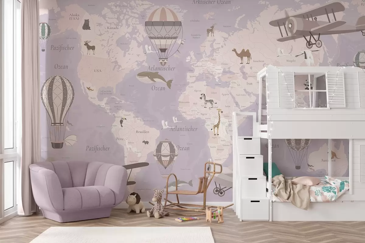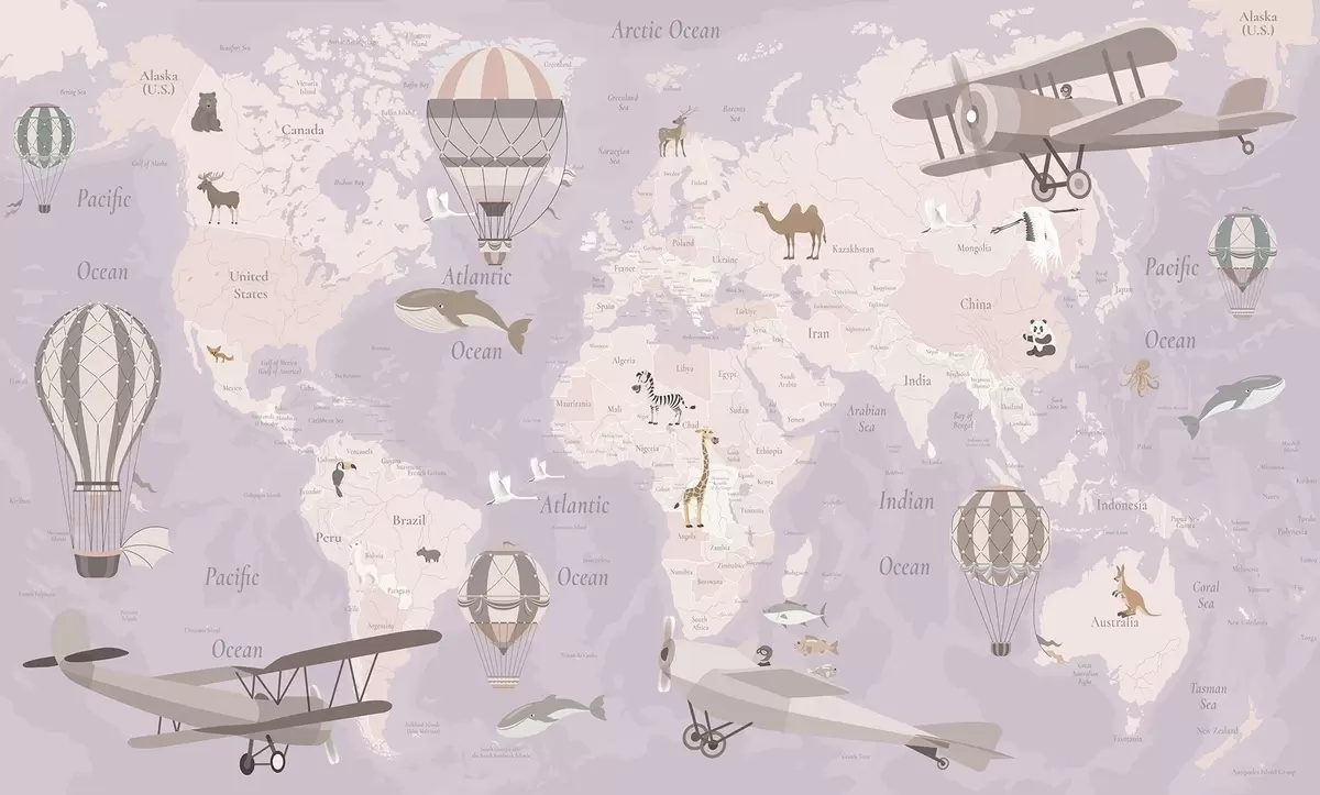 Zidne murale Dječja karta svijeta sa životinjama, avionima i balonima na vrući zrak. Engleski jezik. Ljubičasta boja. br. c00003env4