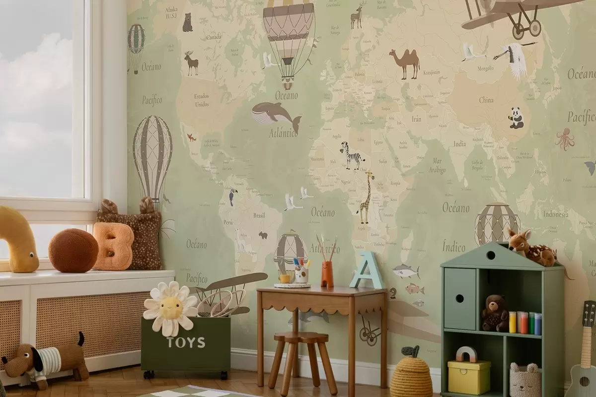 Zidne murale Dječja karta svijeta sa životinjama, avionima i balonima na vrući zrak. Španjolski jezik. Zelena boja. br. c00003esv2