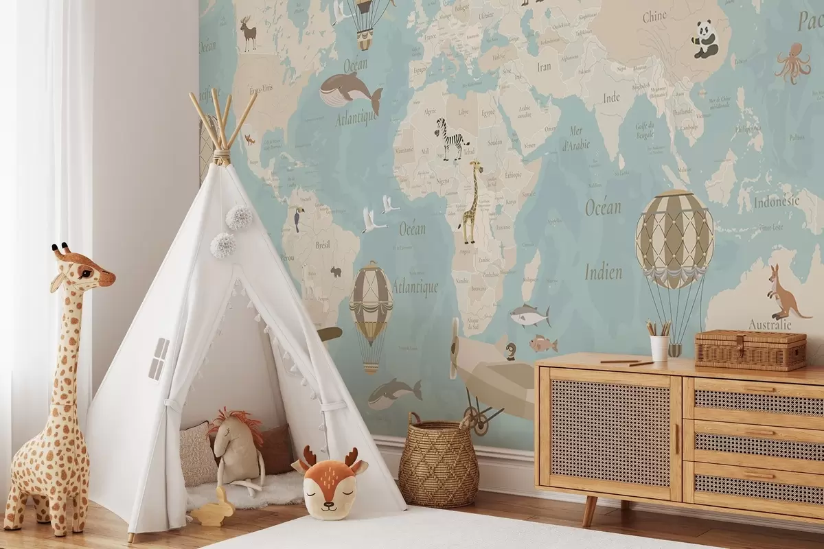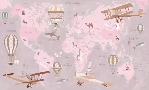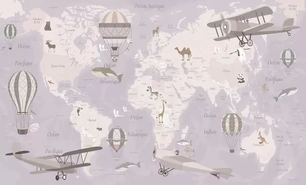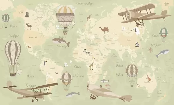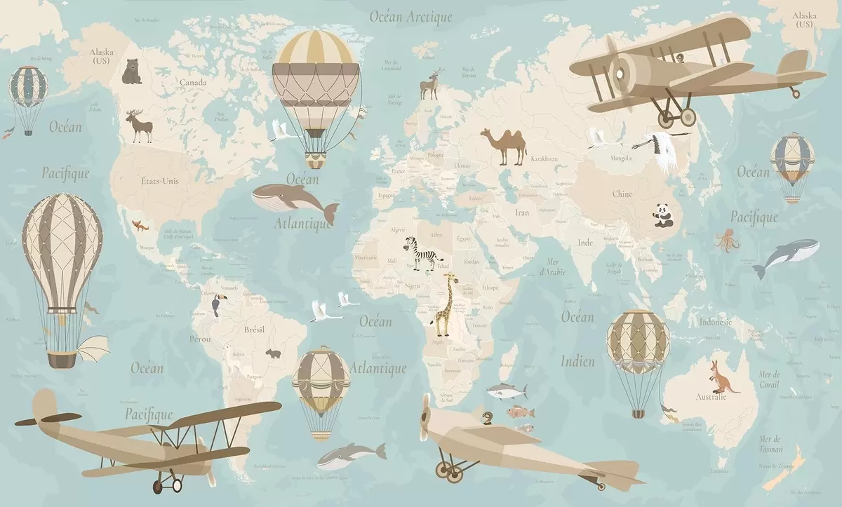 Zidne murale Dječja karta svijeta sa životinjama, avionima i balonima na vrući zrak. Francuski jezik. Plava boja. br. c00003frv1