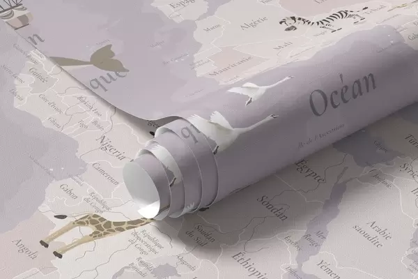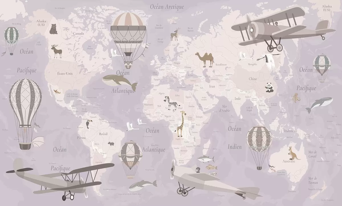 Zidne murale Dječja karta svijeta sa životinjama, avionima i balonima na vrući zrak. Francuski jezik. Ljubičasta boja. br. c00003frv4