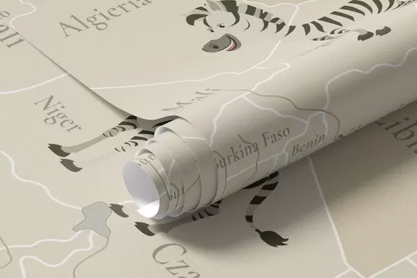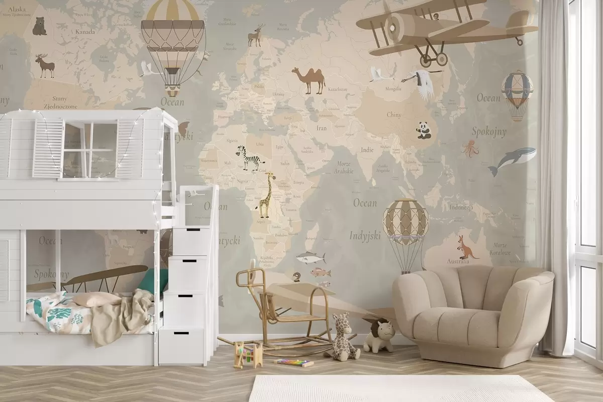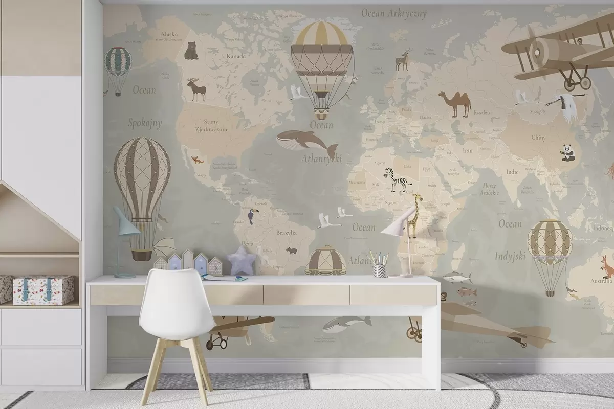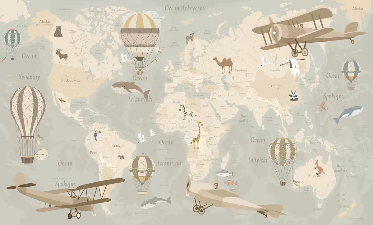 Zidne murale Dječja karta svijeta sa životinjama, avionima i balonima na vrući zrak. Poljski jezik. Bež boja. br. c00003pl