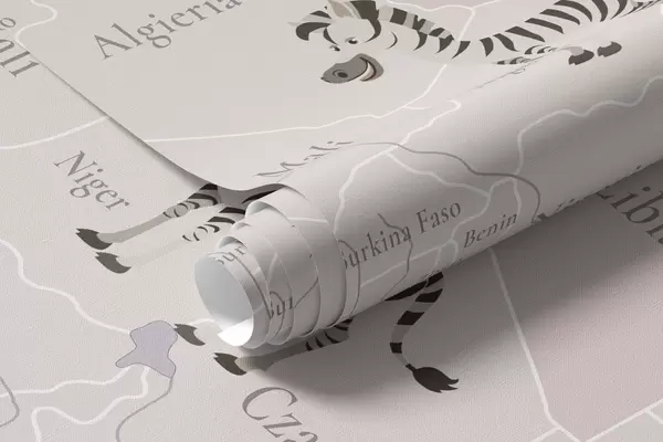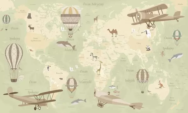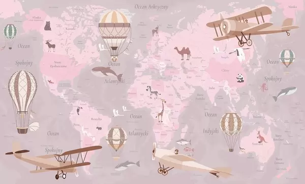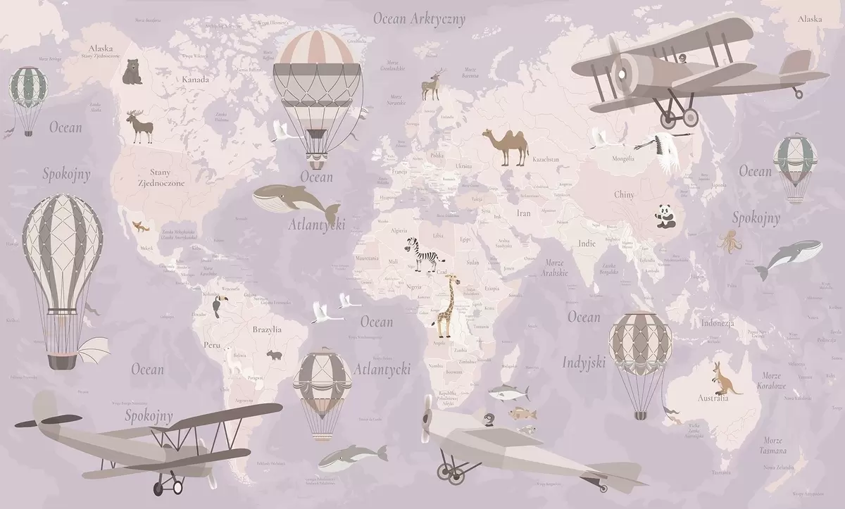 Zidne murale Dječja karta svijeta sa životinjama, avionima i balonima na vrući zrak. Poljski jezik. Ljubičasta boja. br. c00003plv4
