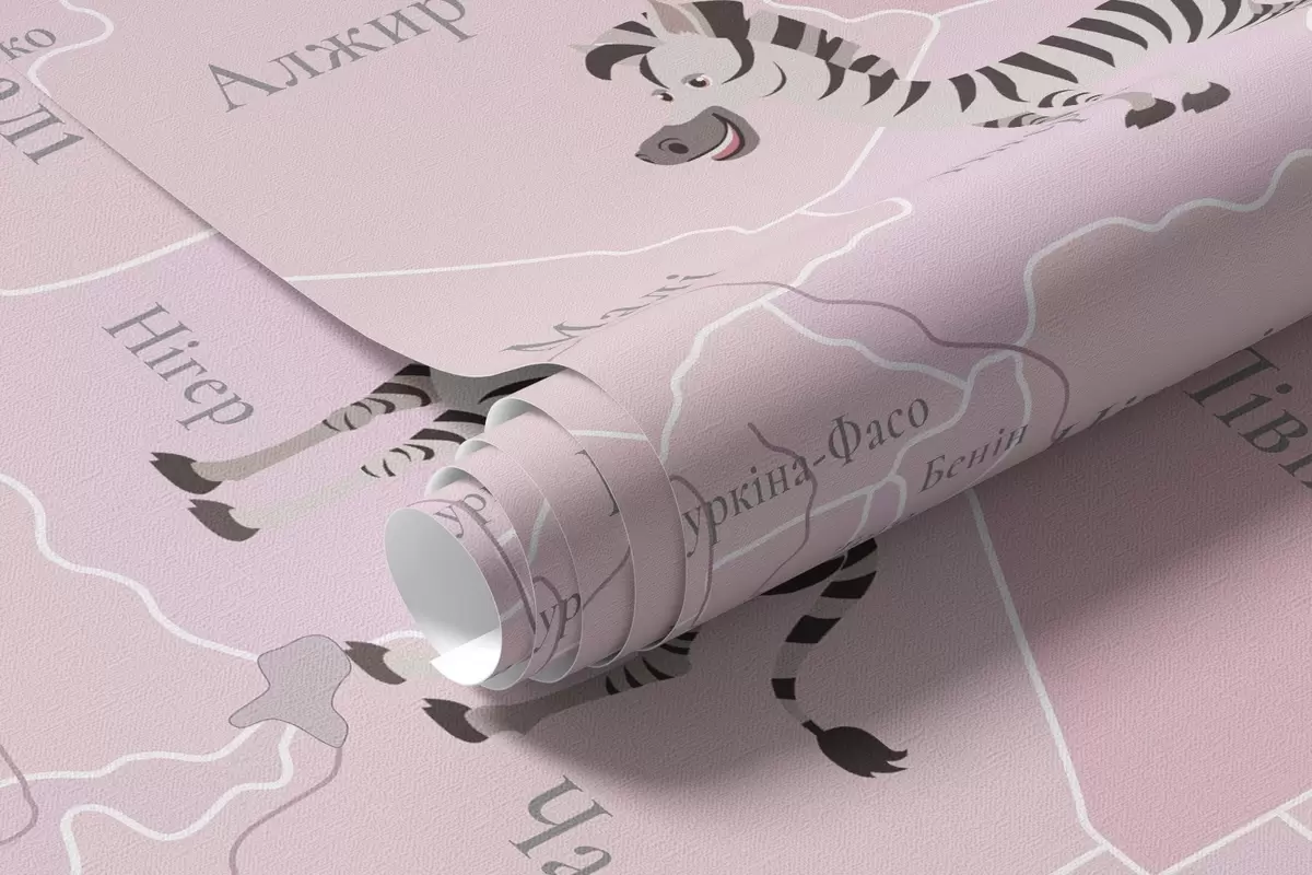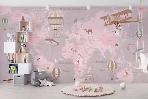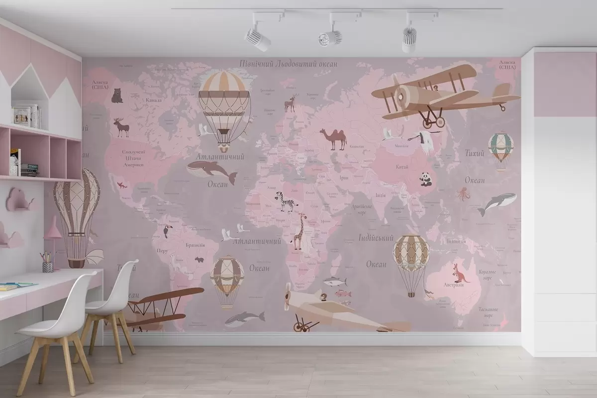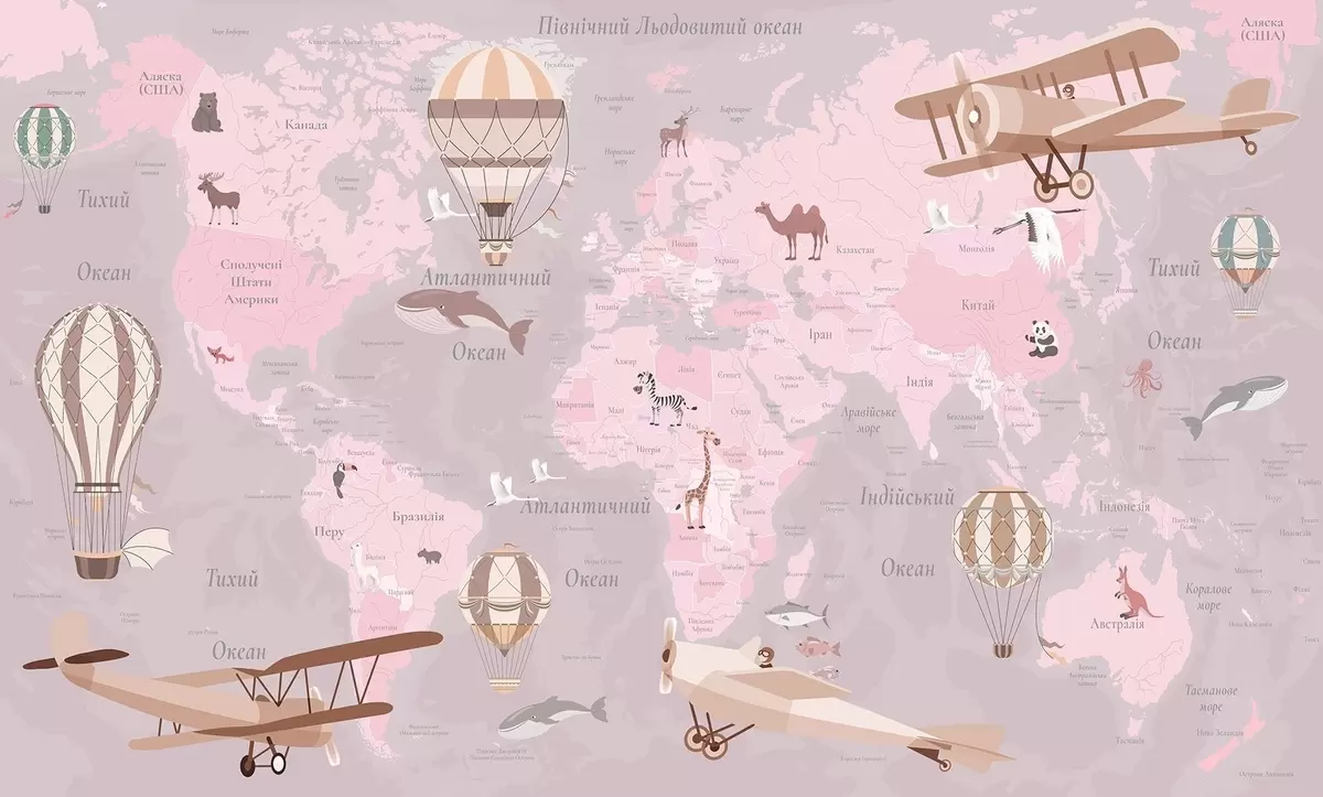 Zidne murale Dječja karta svijeta sa životinjama, avionima i balonima na vrući zrak. Ukrajinski jezik. Ružičasta boja. br. c00003ukv3