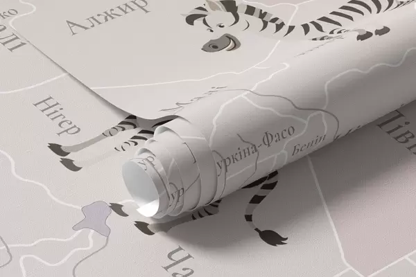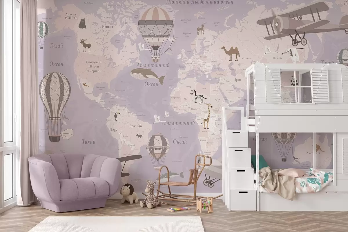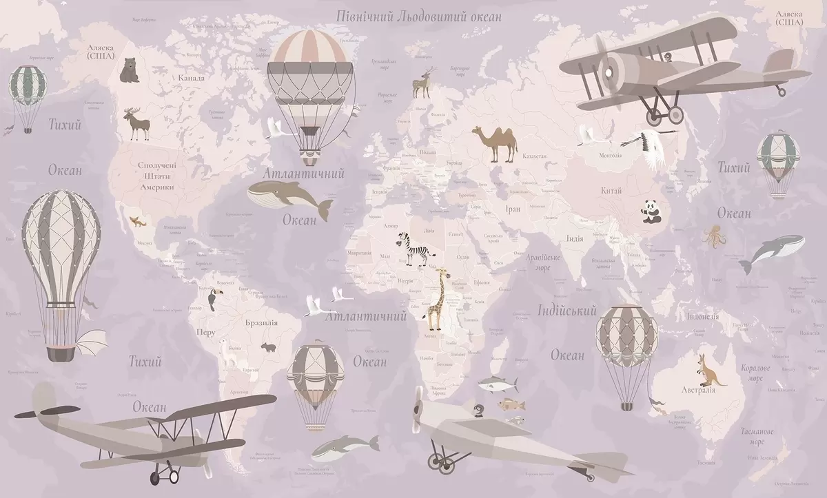Zidne murale Dječja karta svijeta sa životinjama, avionima i balonima na vrući zrak. Ukrajinski jezik. Ljubičasta boja. br. c00003ukv4