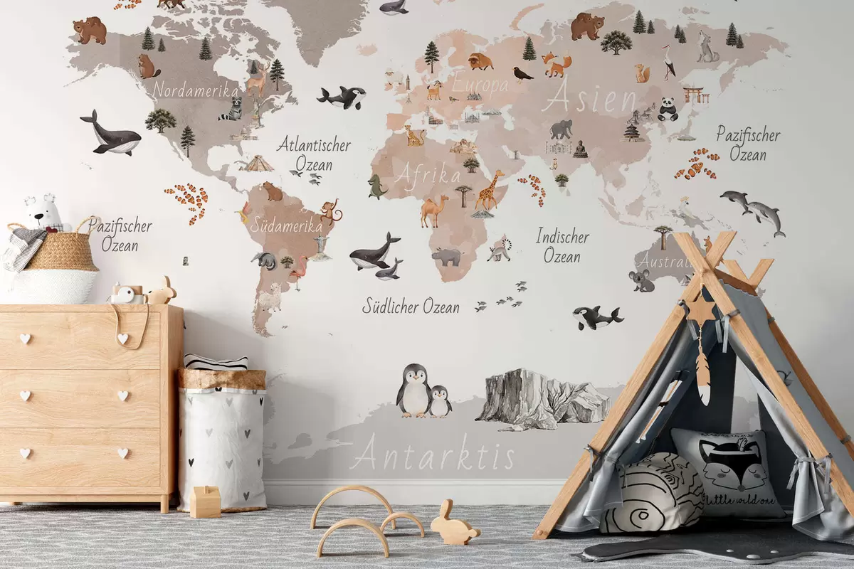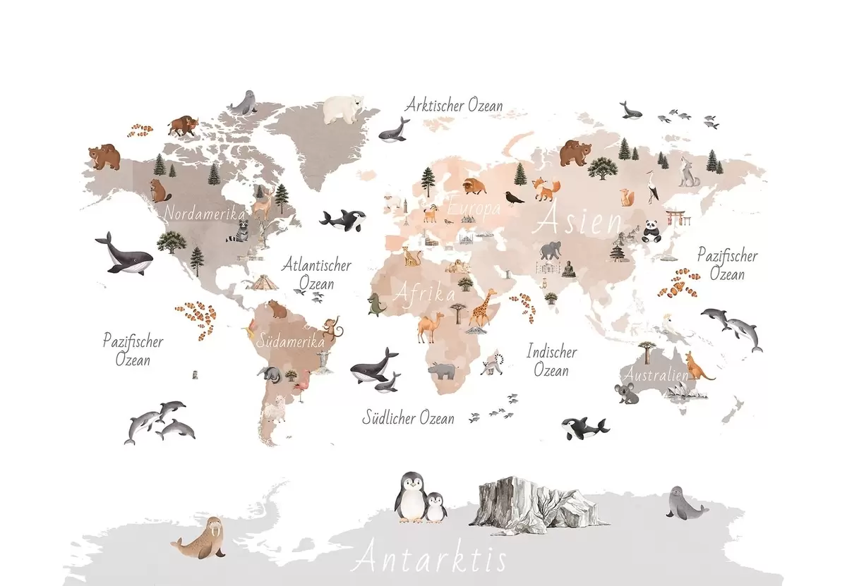Zidne murale Bež karta u akvarelu sa životinjama, biljkama i arhitekturom. Oznake na njemačkom jeziku. br. c00009dev3