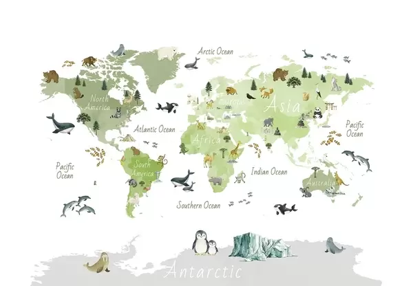 Zidne murale Karta u boji u akvarelu s prikazima životinja, biljaka i arhitekture. Oznake na engleskom jeziku. br. c00009en