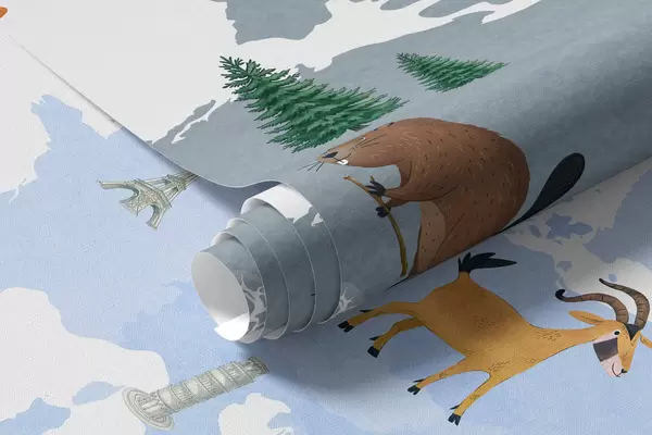 Zidne murale Plava karta u akvarelu sa životinjama, biljkama i arhitekturom. Oznake na engleskom jeziku. br. c00009env1