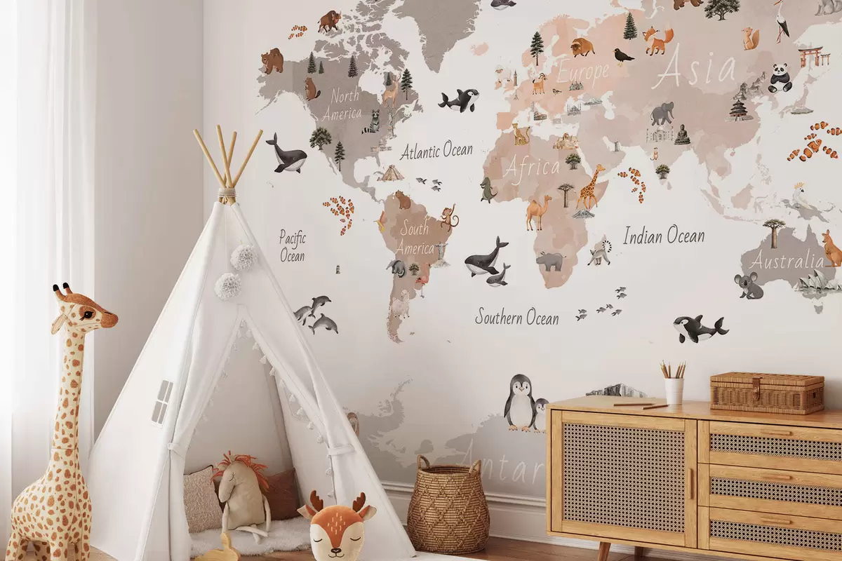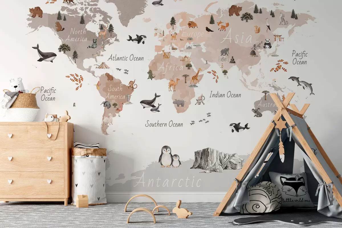 Zidne murale Bež karta u akvarelu sa životinjama, biljkama i arhitekturom. Oznake na engleskom jeziku. br. c00009env3