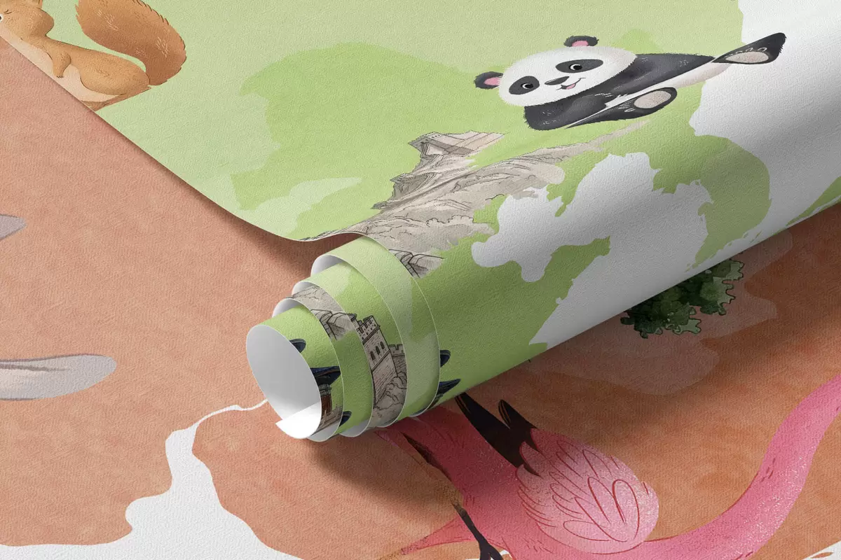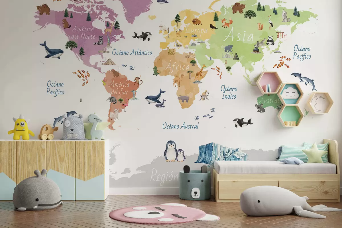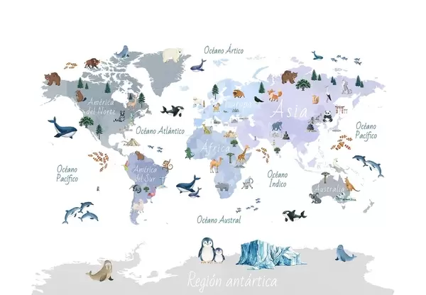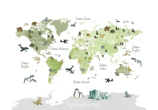 Zidne murale Karta u boji u akvarelu s prikazima životinja, biljaka i arhitekture. Oznake na španjolskom. br. c00009es