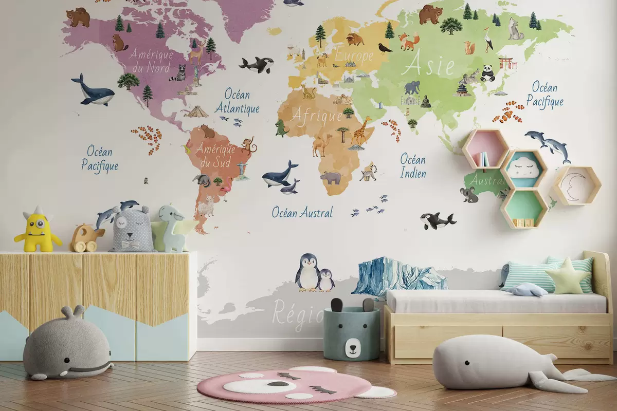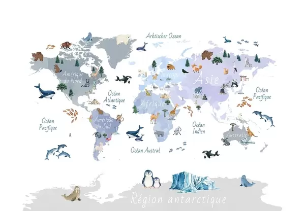 Zidne murale Karta u boji u akvarelu sa životinjama, biljkama i arhitekturom. Oznake na francuskom jeziku. br. c00009fr