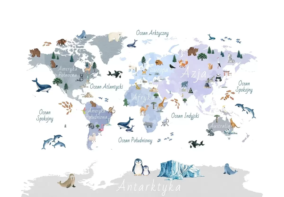 Zidne murale Plava karta u akvarelu sa životinjama, biljkama i arhitekturom. Oznake na poljskom. br. c00009plv1