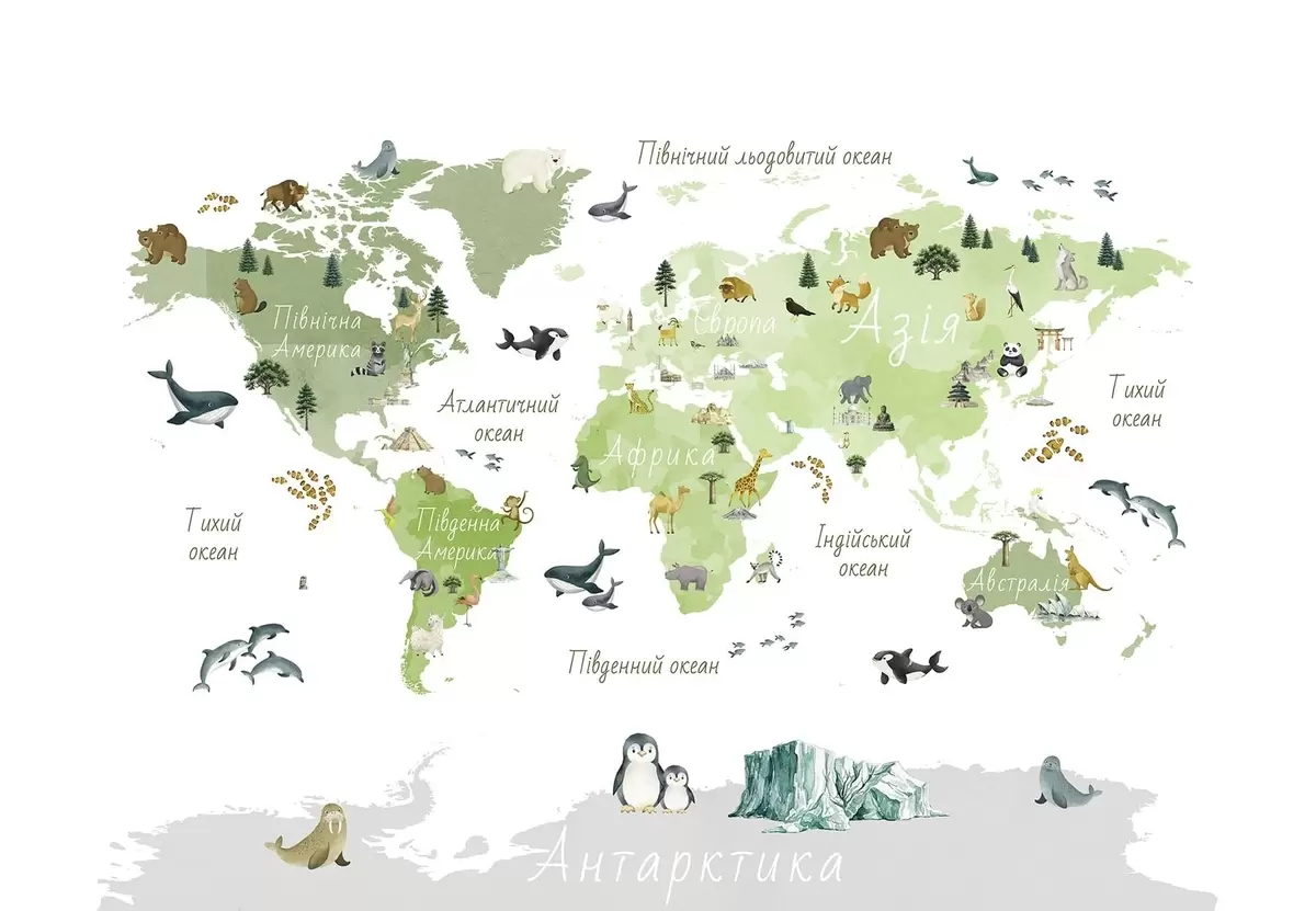 Zidne murale Zelena karta u akvarelu sa životinjama, biljkama i arhitekturom. Oznake na ukrajinskom. br. c00009ukv2