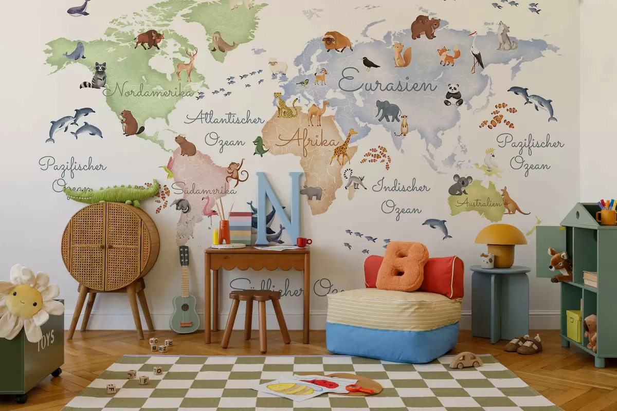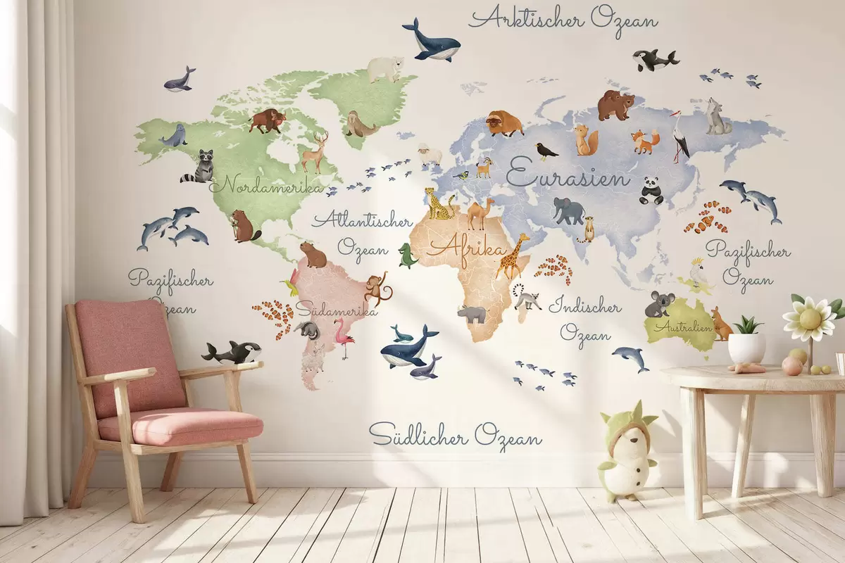 Zidne murale Bijela karta u akvarelu sa životinjama. Oznake na njemačkom jeziku. br. c00012de