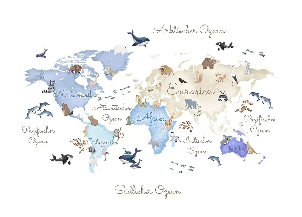 Zidne murale Plava karta u akvarelu sa životinjama. Oznake na njemačkom jeziku. br. c00012dev1