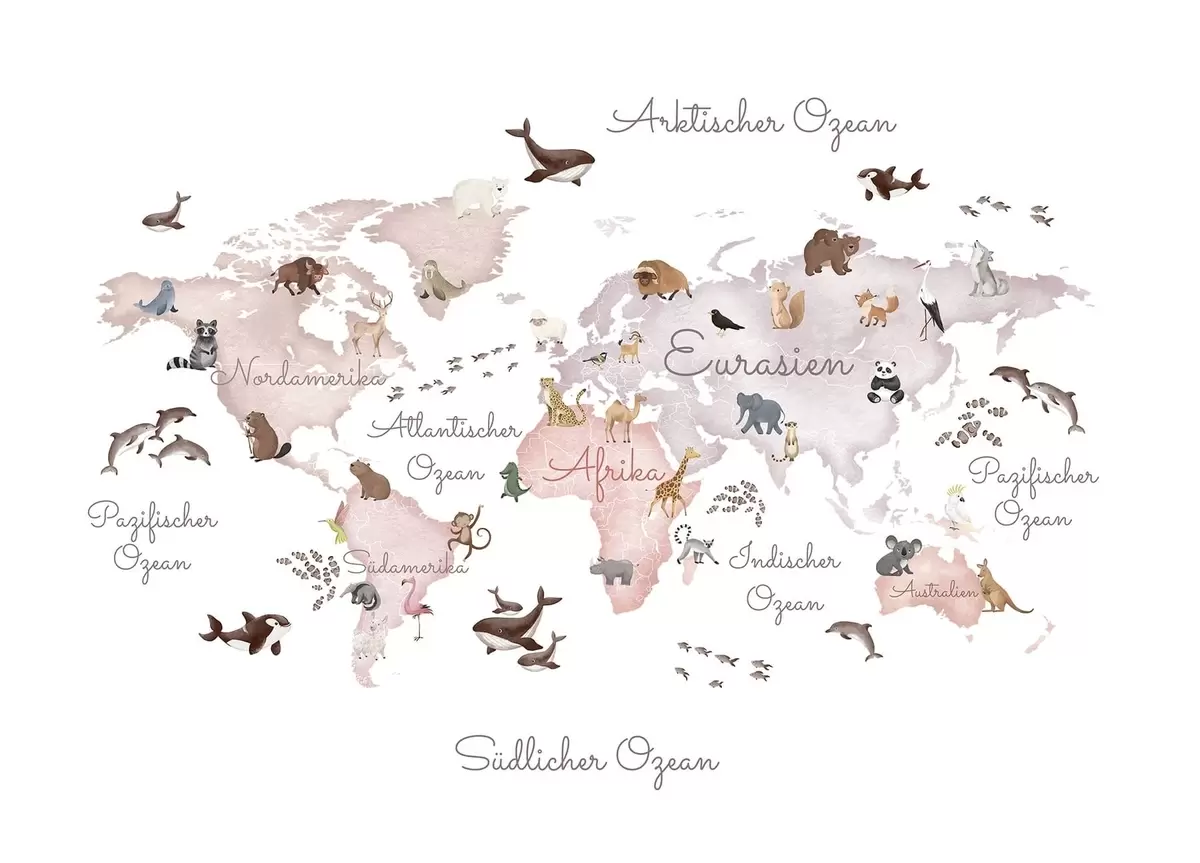 Zidne murale Bež karta u akvarelu sa životinjama. Oznake na njemačkom jeziku. br. c00012dev3