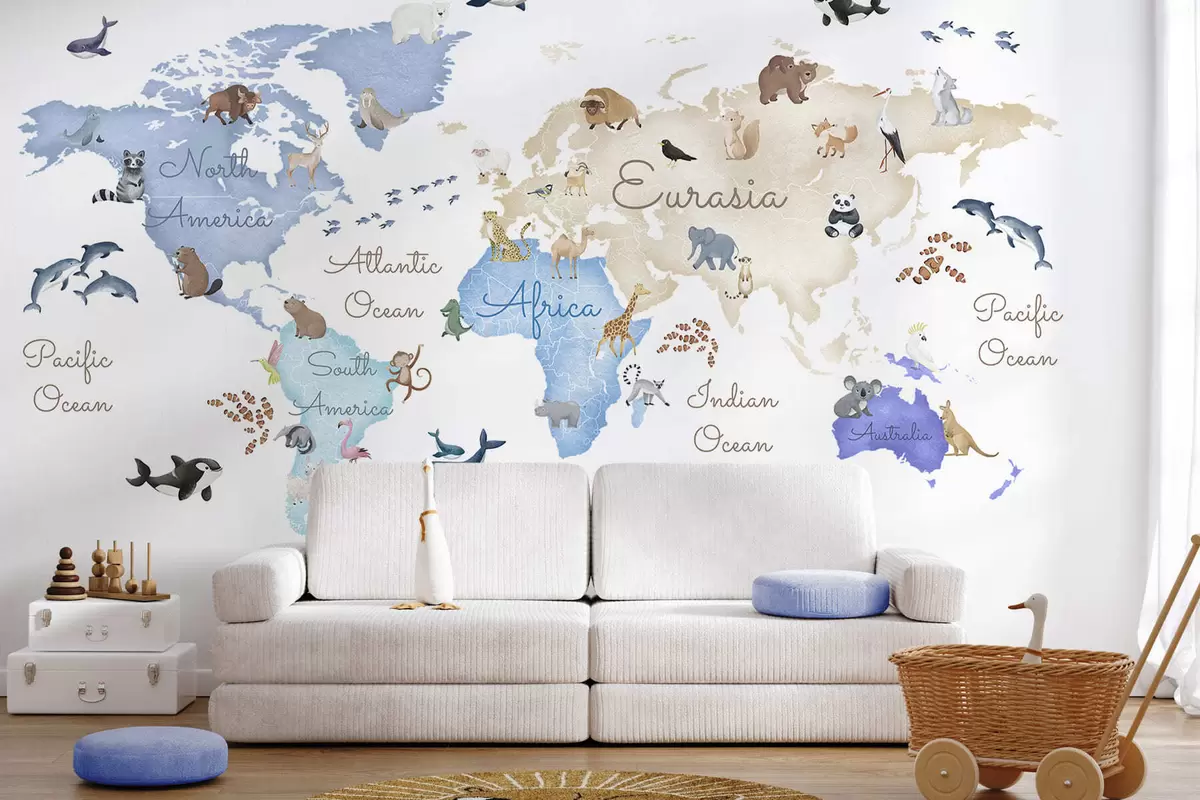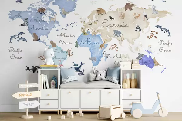 Zidne murale Plava karta u akvarelu sa životinjama. Oznake na engleskom jeziku. br. c00012env1