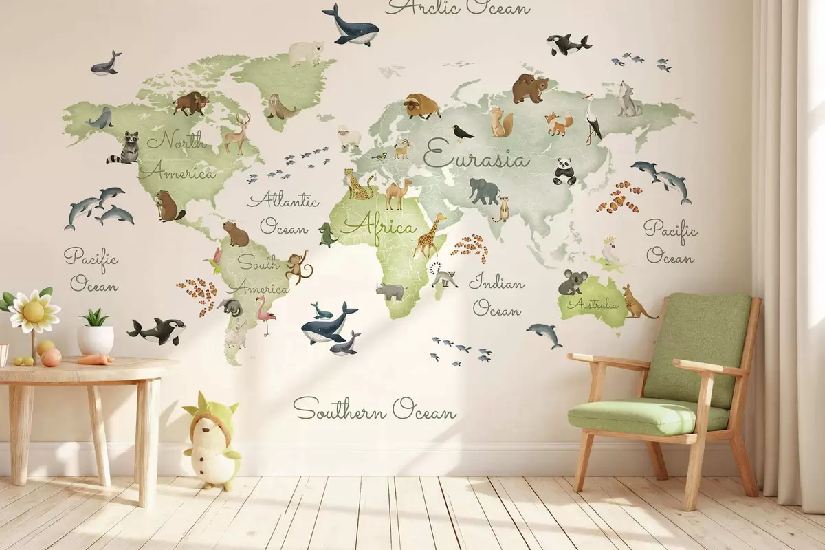Zidne murale Zelena karta u akvarelu sa životinjama. Oznake na engleskom jeziku. br. c00012env2