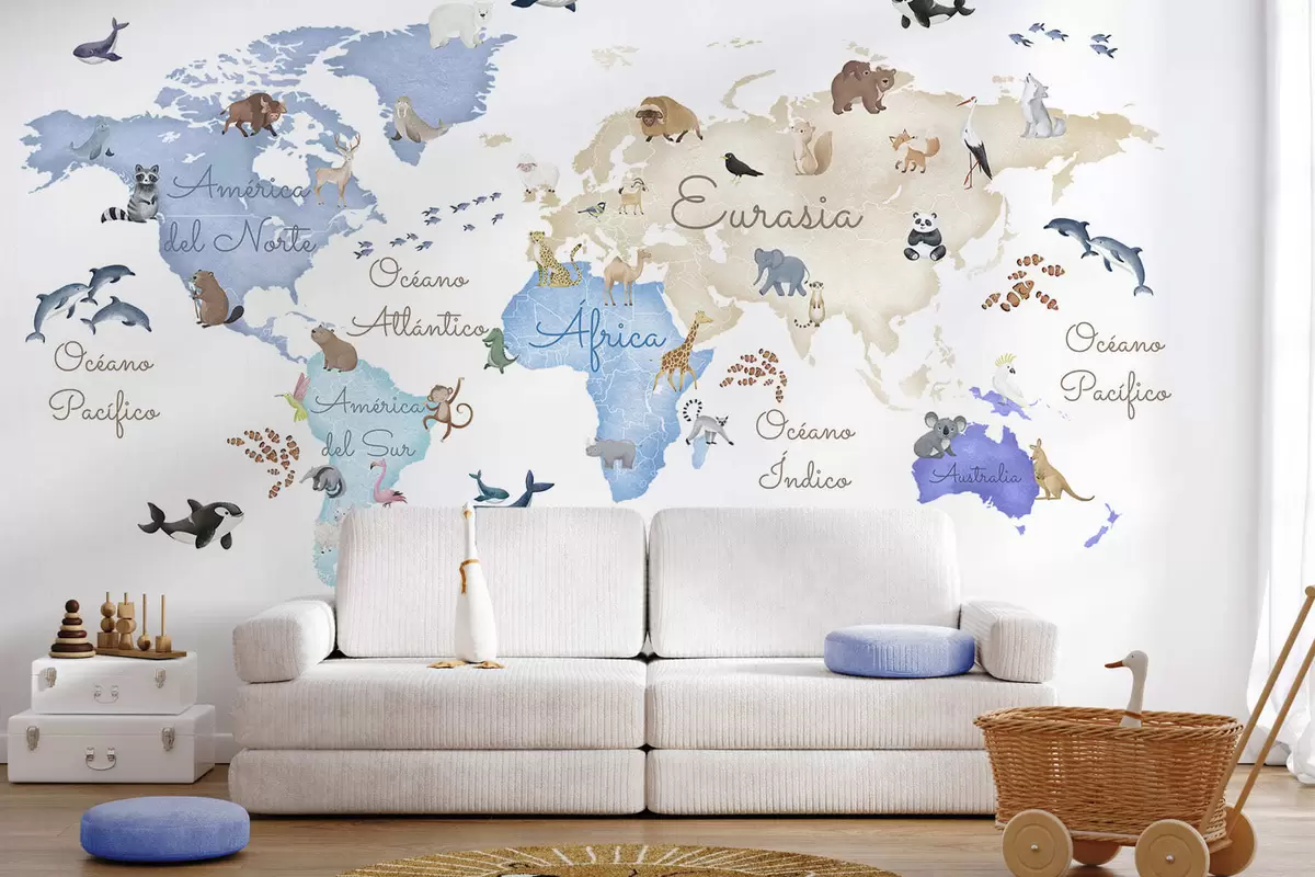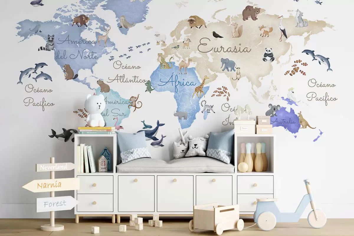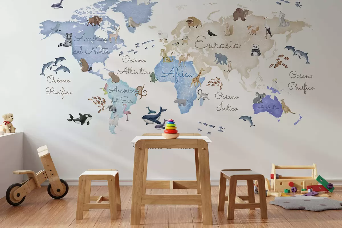 Zidne murale Plava karta u akvarelu sa životinjama. Oznake na španjolskom. br. c00012esv1