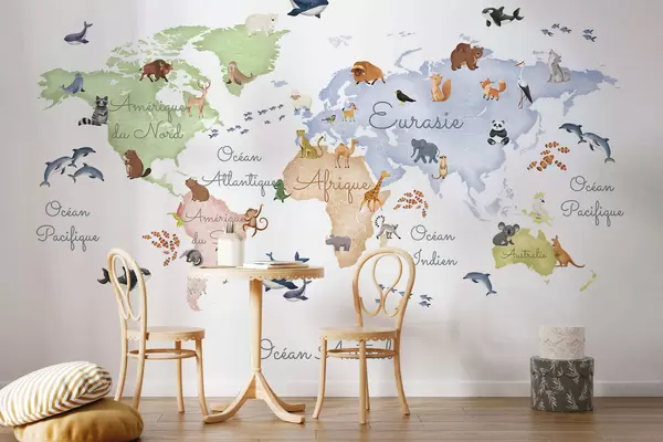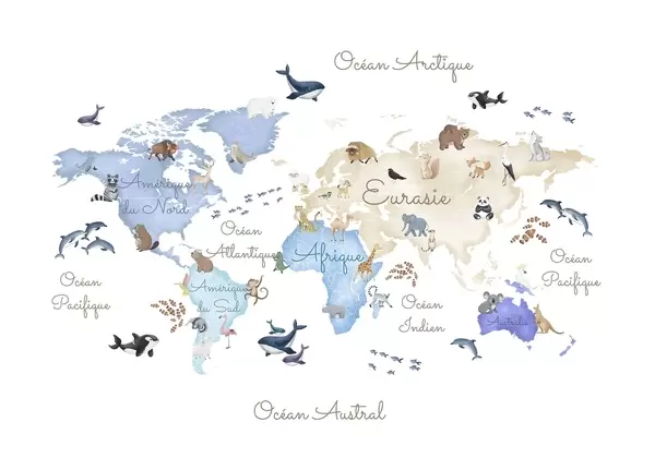 Zidne murale Karta u boji u akvarelu sa životinjama. Oznake na francuskom jeziku. br. c00012fr
