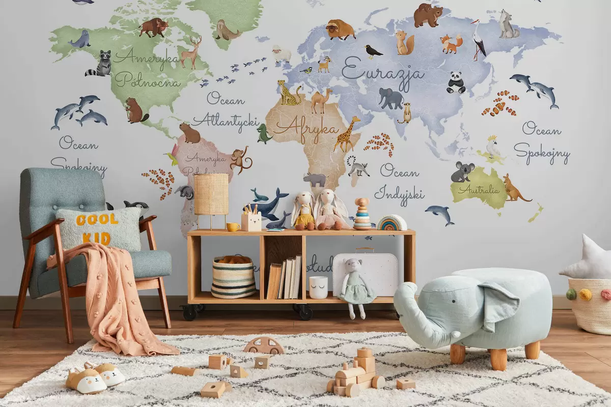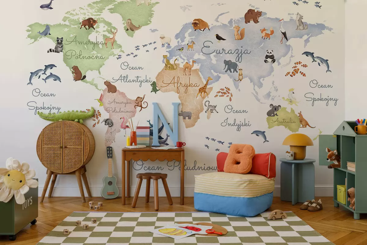 Zidne murale Karta u boji u akvarelu sa životinjama. Oznake na poljskom. br. c00012pl