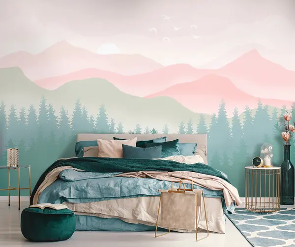 zidne murale Maglovite planine s borovom šumom, nježne prirodne boje, ružičasta i zelena u98774