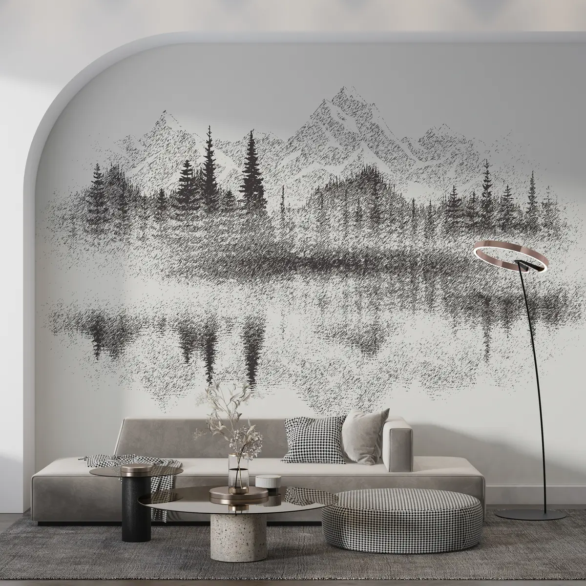 Zidne murale Šuma i planine ogledaju se u jezeru br. u98808
