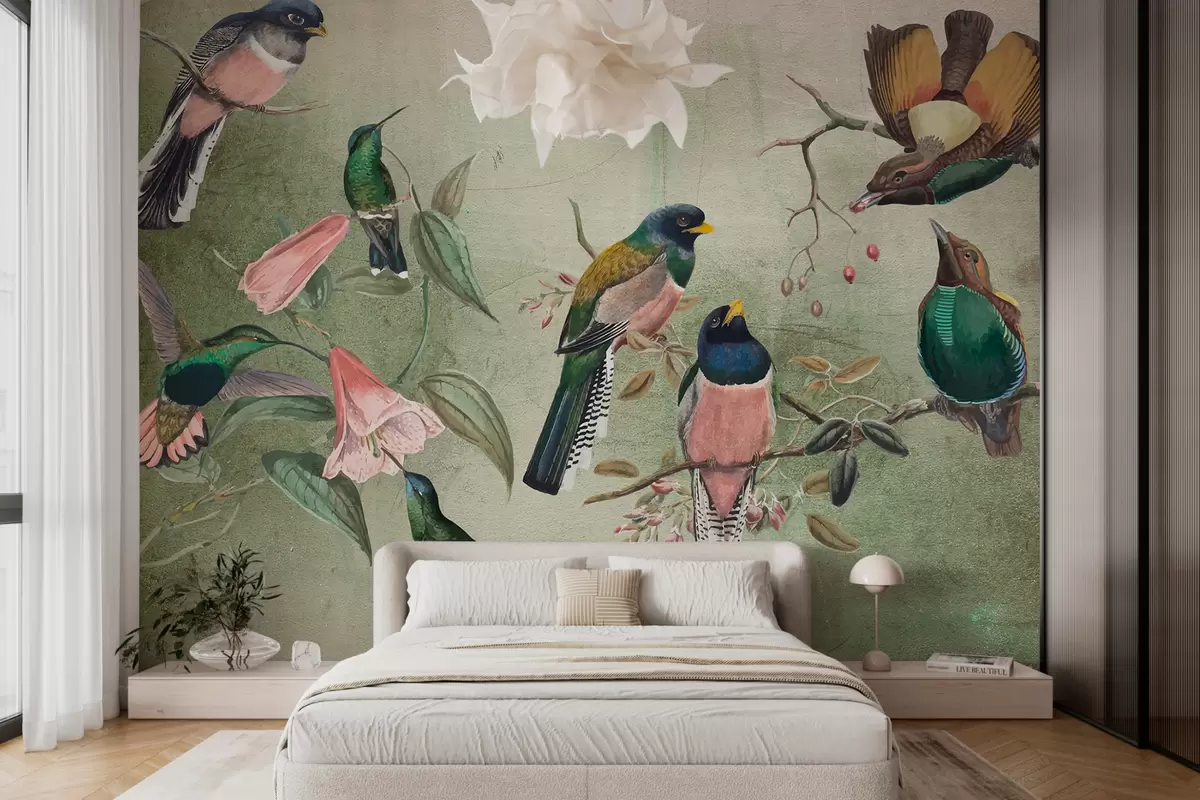 Zidne murale Grupa šarenih ptica sjedi na granama u teksturiranoj pozadini br. w00543