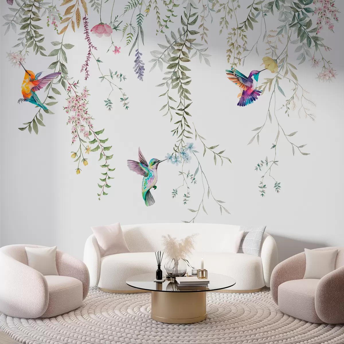 Zidne murale Viseće cvijeće i lišće i prekrasni kolibrići br. w00660
