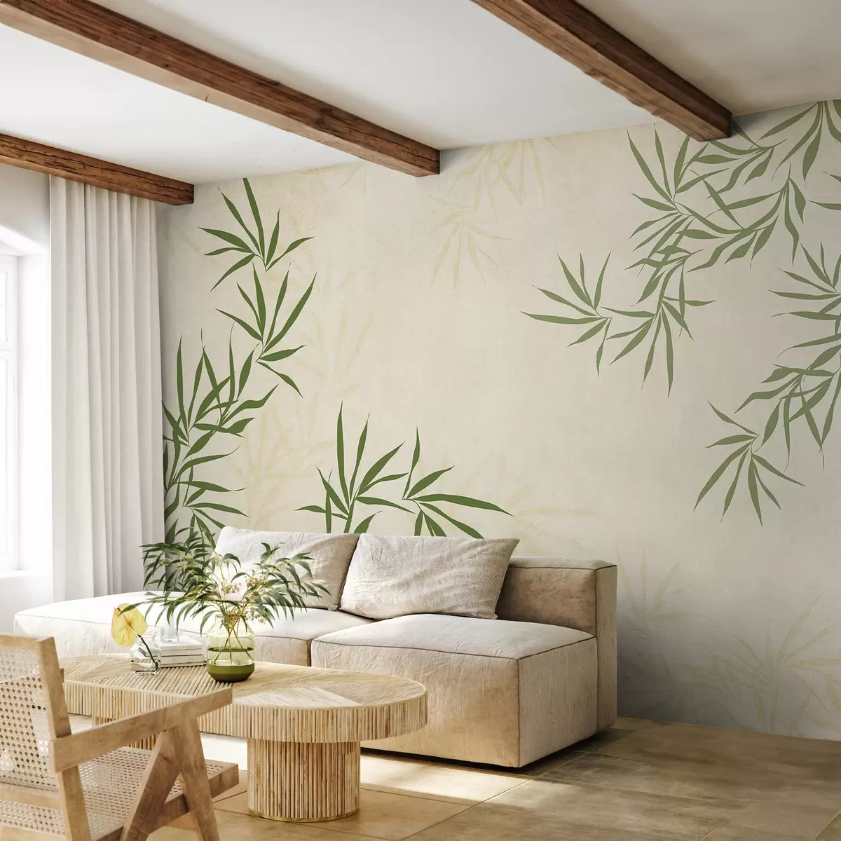 Zidne murale Biljne grančice, bambus, vintage stil, tekstura pozadine, žuta, zelena boja br. w00817