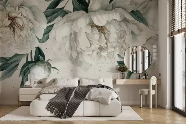Zidne murale Veliki bijeli božuri sa zelenim lišćem na pozadini svijetle teksture br. w00837