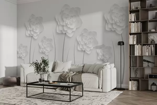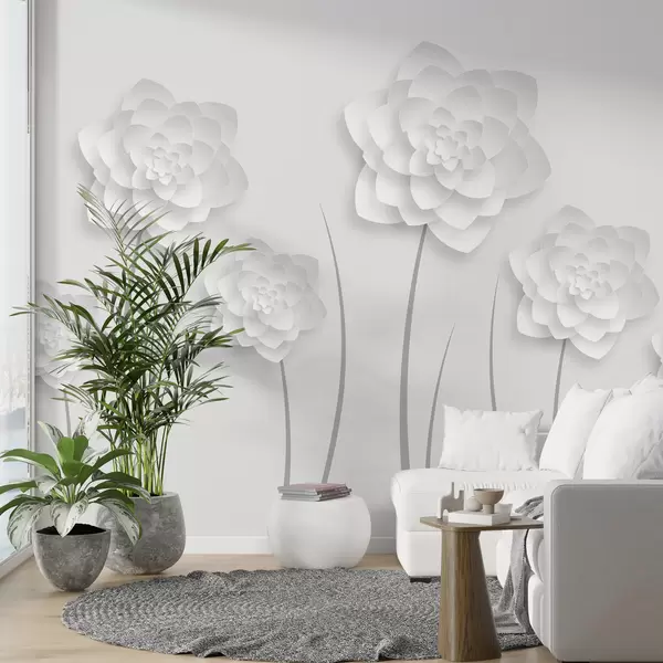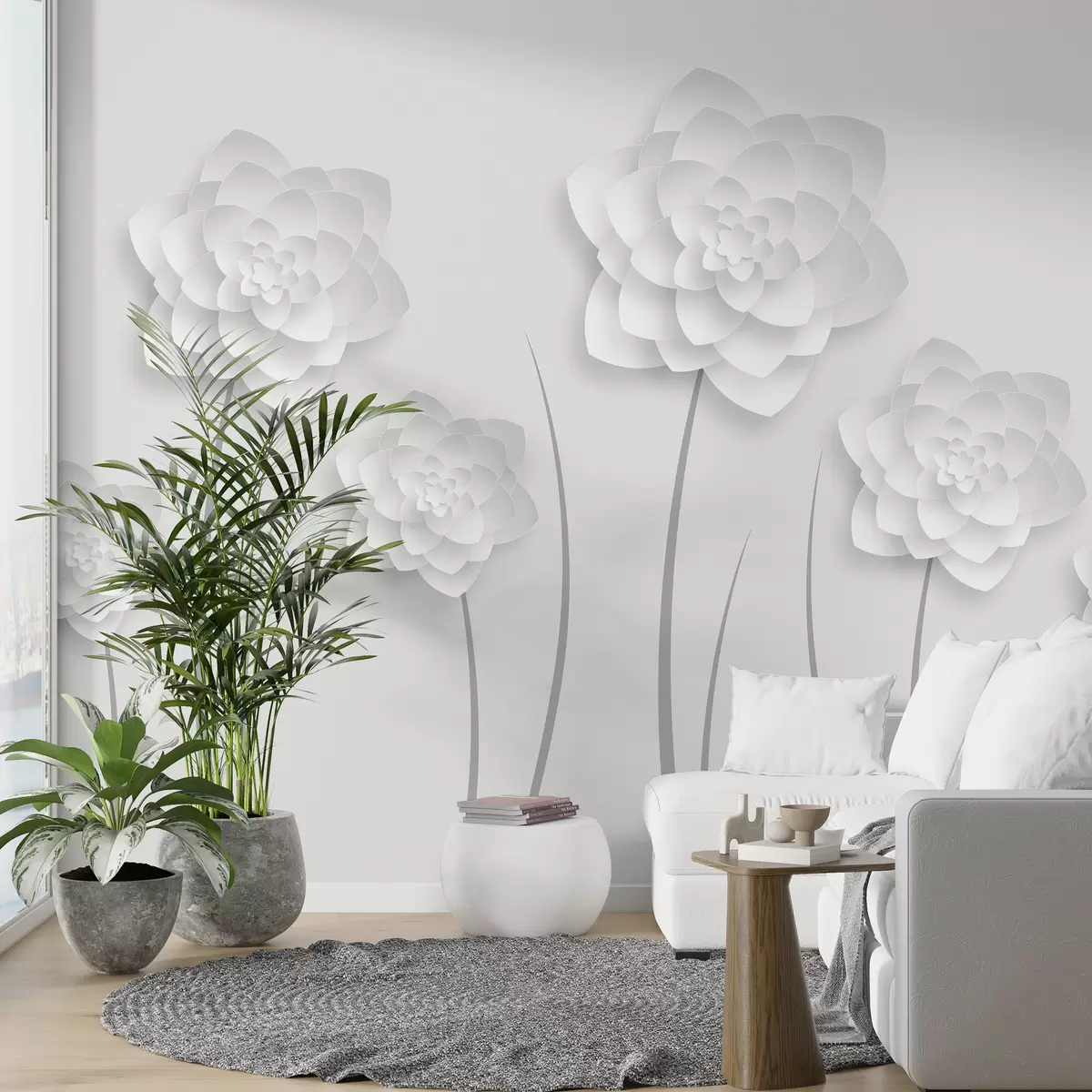 Zidne murale Veliki cvjetovi s imitacijom volumena u stilu papira na svijetlo sivoj pozadini sa sivom stabljikom br. w01021