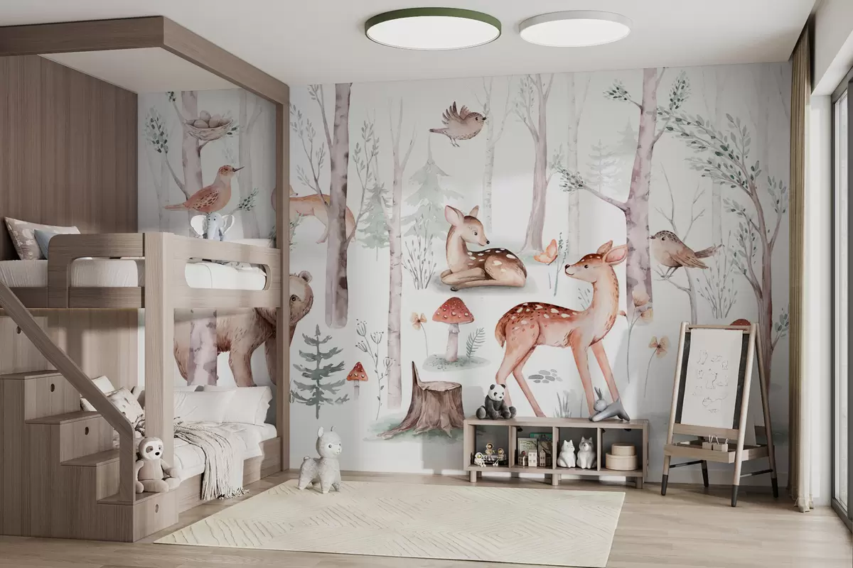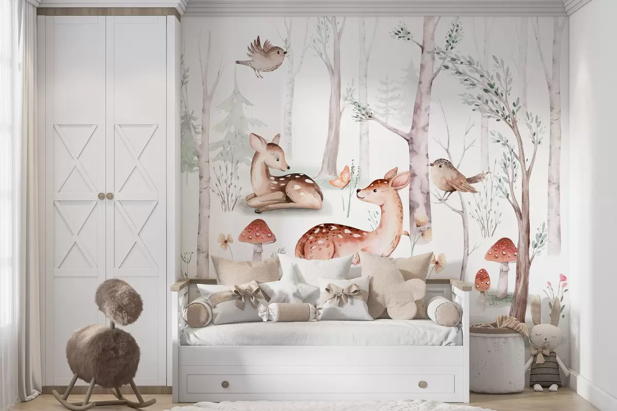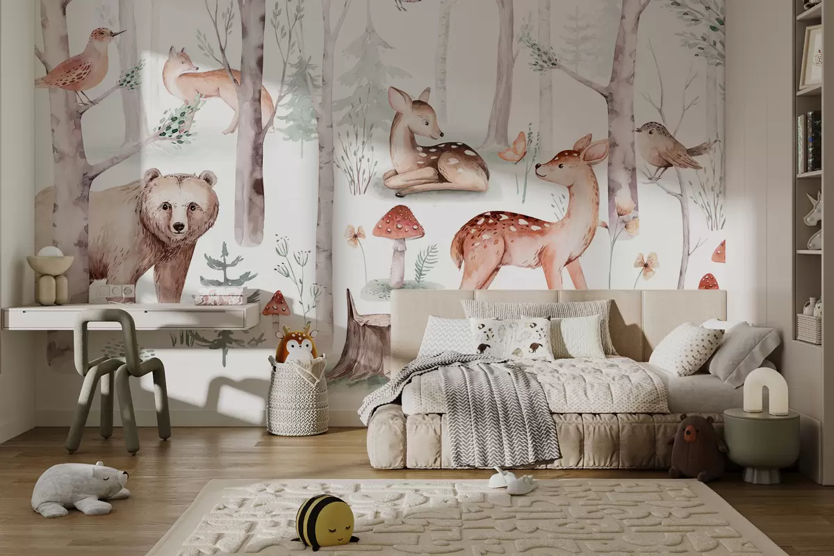 Zidne murale Tapete za dječju sobu, šumske životinje. Delikatna tapeta u stilu akvarela u ugodnim toplim pastelnim bojama na bijeloj pozadini br. w01089