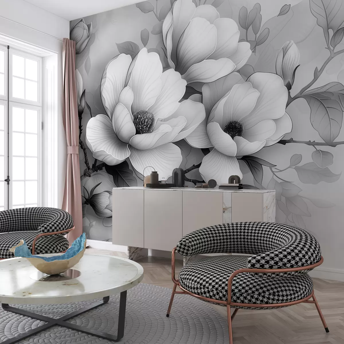 Zidne murale Crno-bijela ilustracija magnolije na sivoj pozadini br. w01277