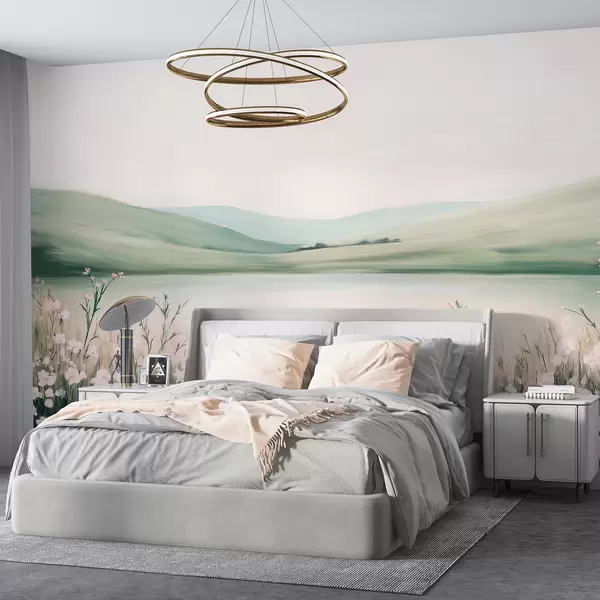 Zidne murale Cvjetna livada, prirodni krajolik, jezero, ružičasto cvijeće, zeleni brežuljci br. w01387