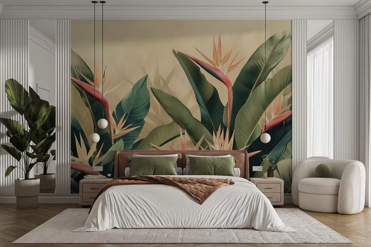 Zidne murale Bujni raspored tropskog cvijeća okružen velikim tamnozelenim lišćem br. w01484v1