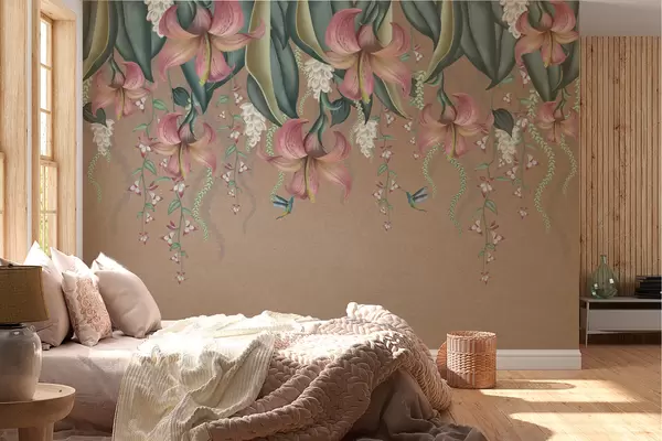 Zidne murale Delikatni botanički motiv s visećim ljiljanima, cvijećem i kolibrićima na grunge zidu br. w01523