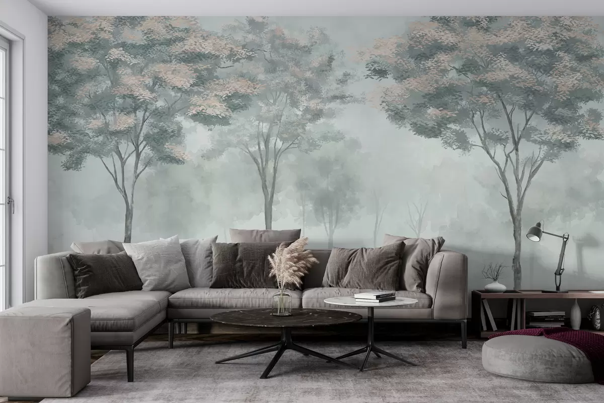 Zidne murale Maglovita šumska silueta u zelenim, svijetlo sivim i bež bojama br. w01599