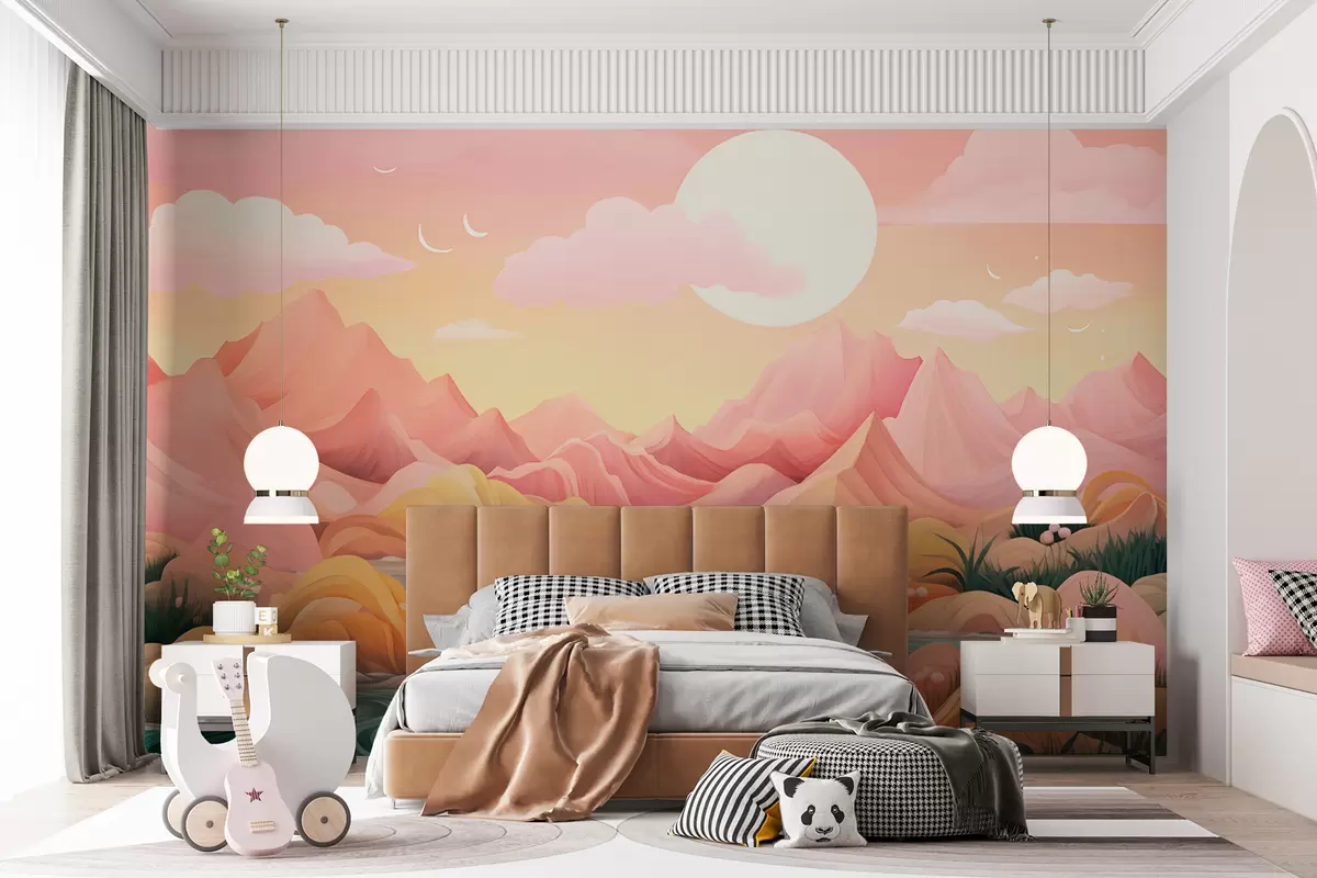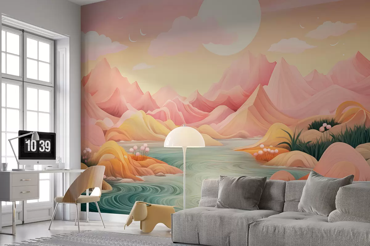 Zidne murale Fantastičan krajolik pastelnih boja s nježno ružičastim i planinama boje breskve br. w01656