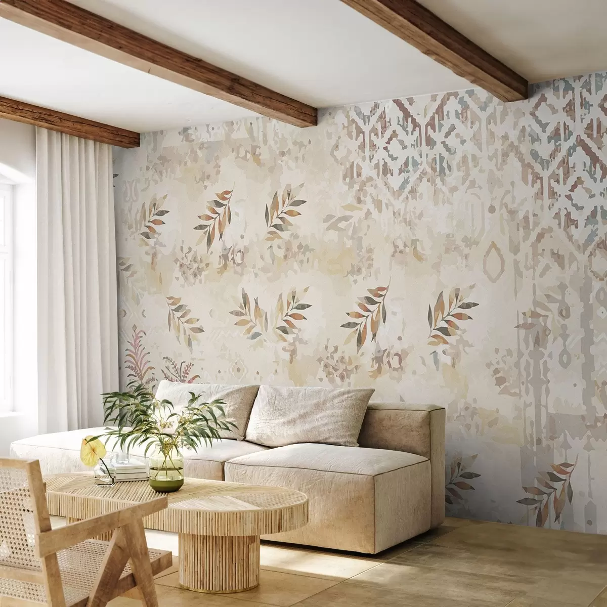 Zidne murale tapete u retro stilu s uzorcima, elementima abrazije, mrljama i lišćem, u bež bojama br. w01955