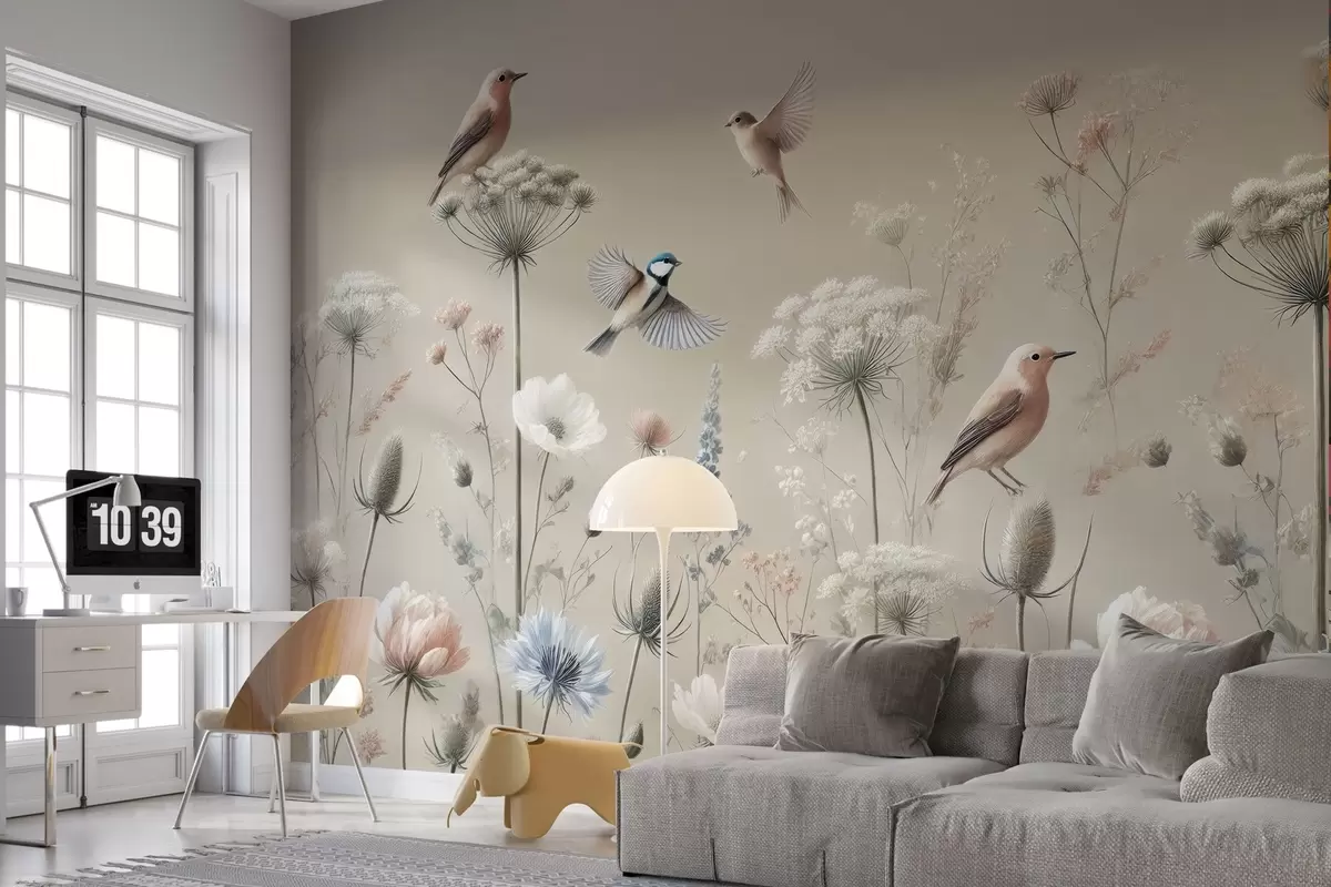 zidne murale Nježno poljsko cvijeće s pticama na bež pozadini w01958